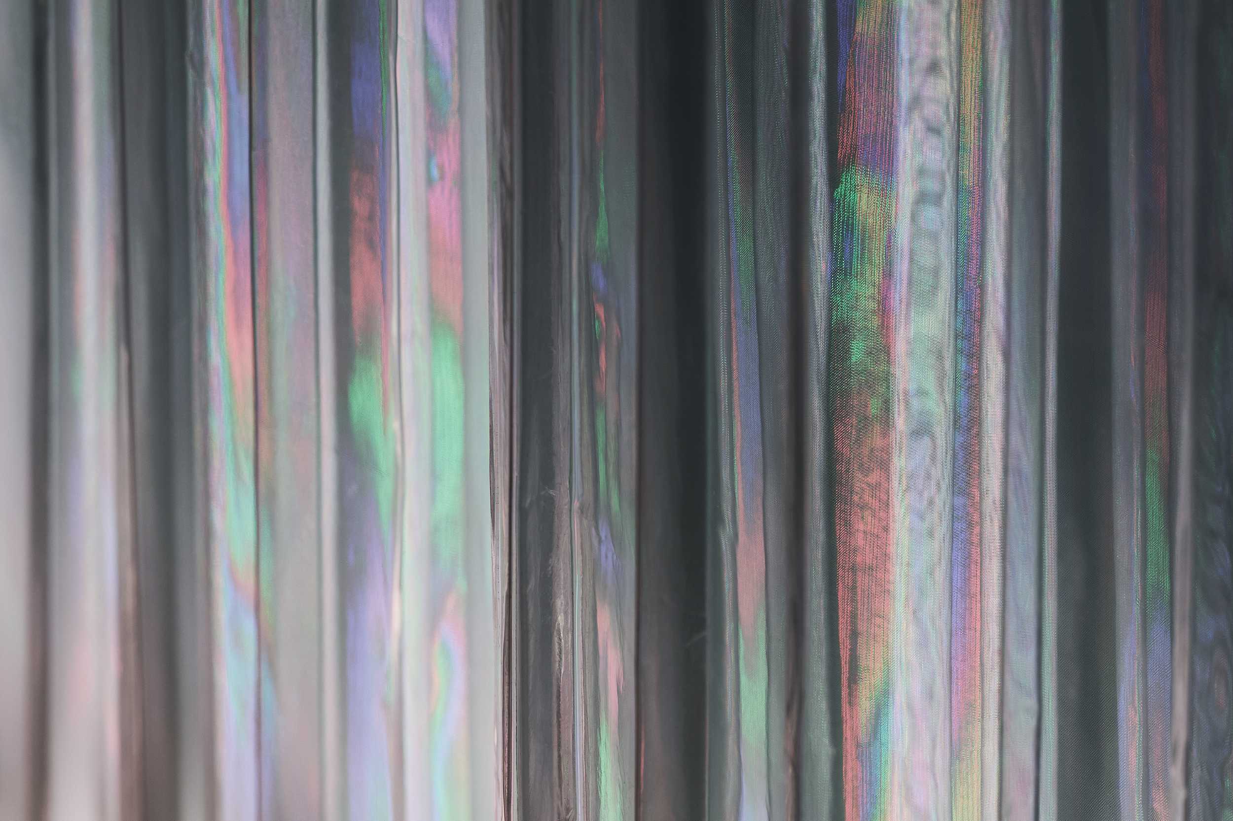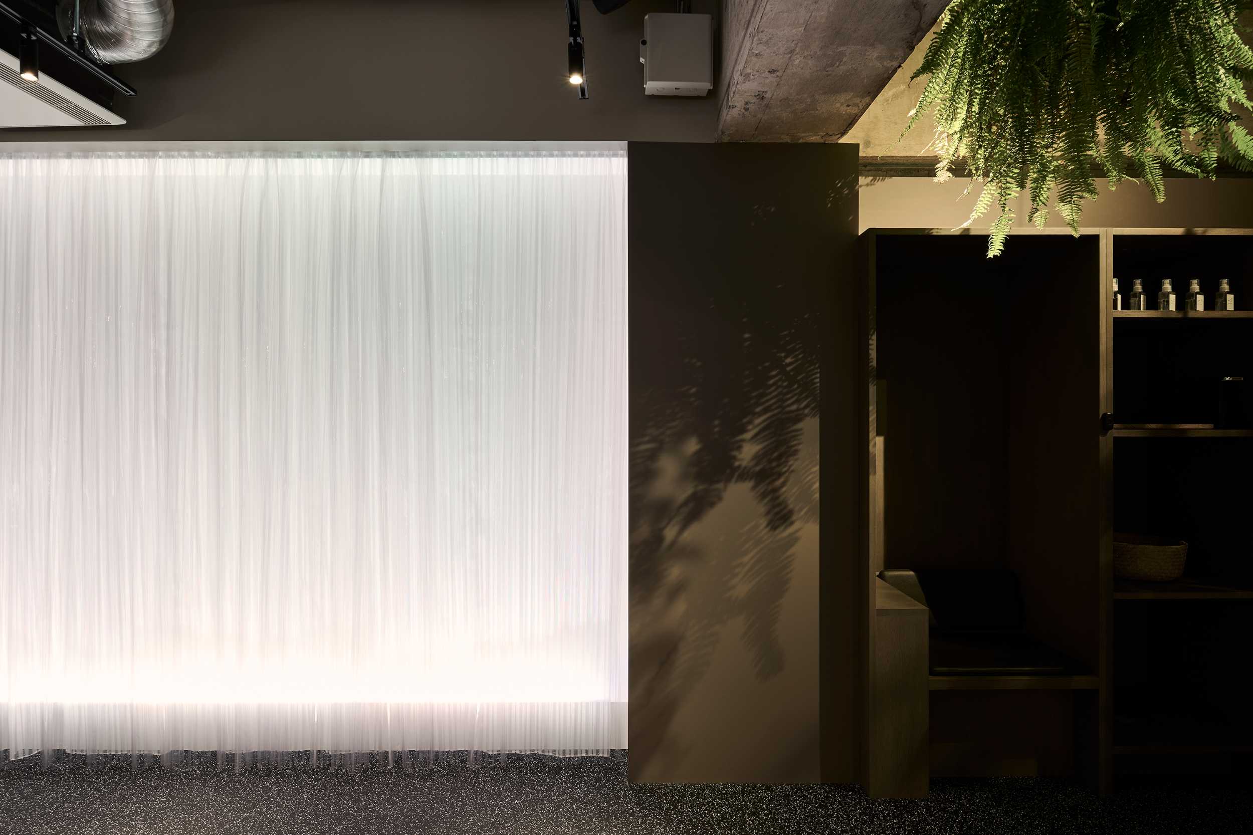 この空間の鍵は、壁面の演出。幾度もの検討を経て、水の現象を創るという答えに辿り着き、その想いを@fabricscapeに託しました。そこに現れたのはオーガンジーと薄いビニールにプリーツを施したダブルスキンのカーテン。プリーツがモアレを生み、ビニール膜が像をやわらかく歪ませ、LEDのRGBが反射してプリズムの輝きを放ちます。