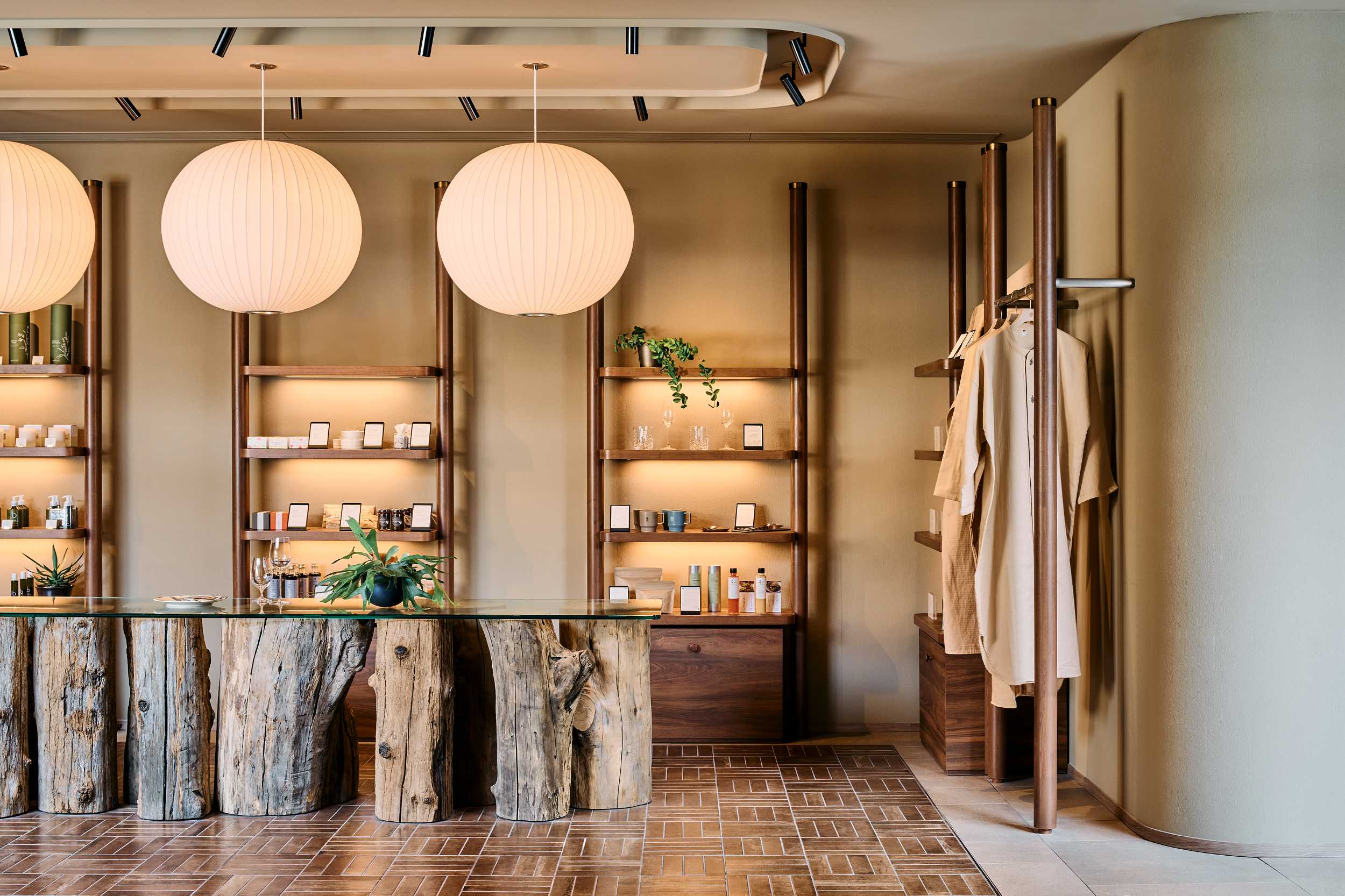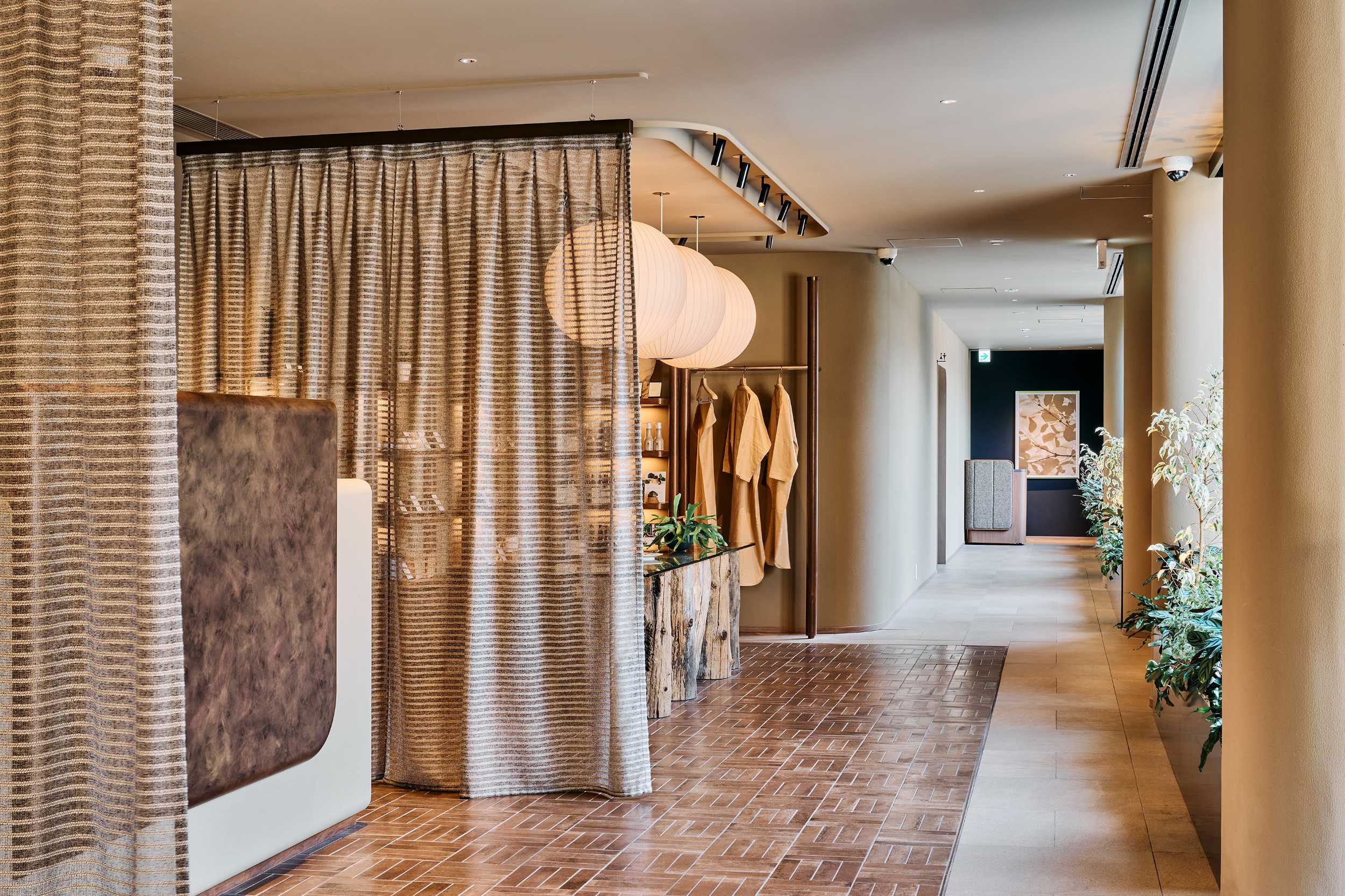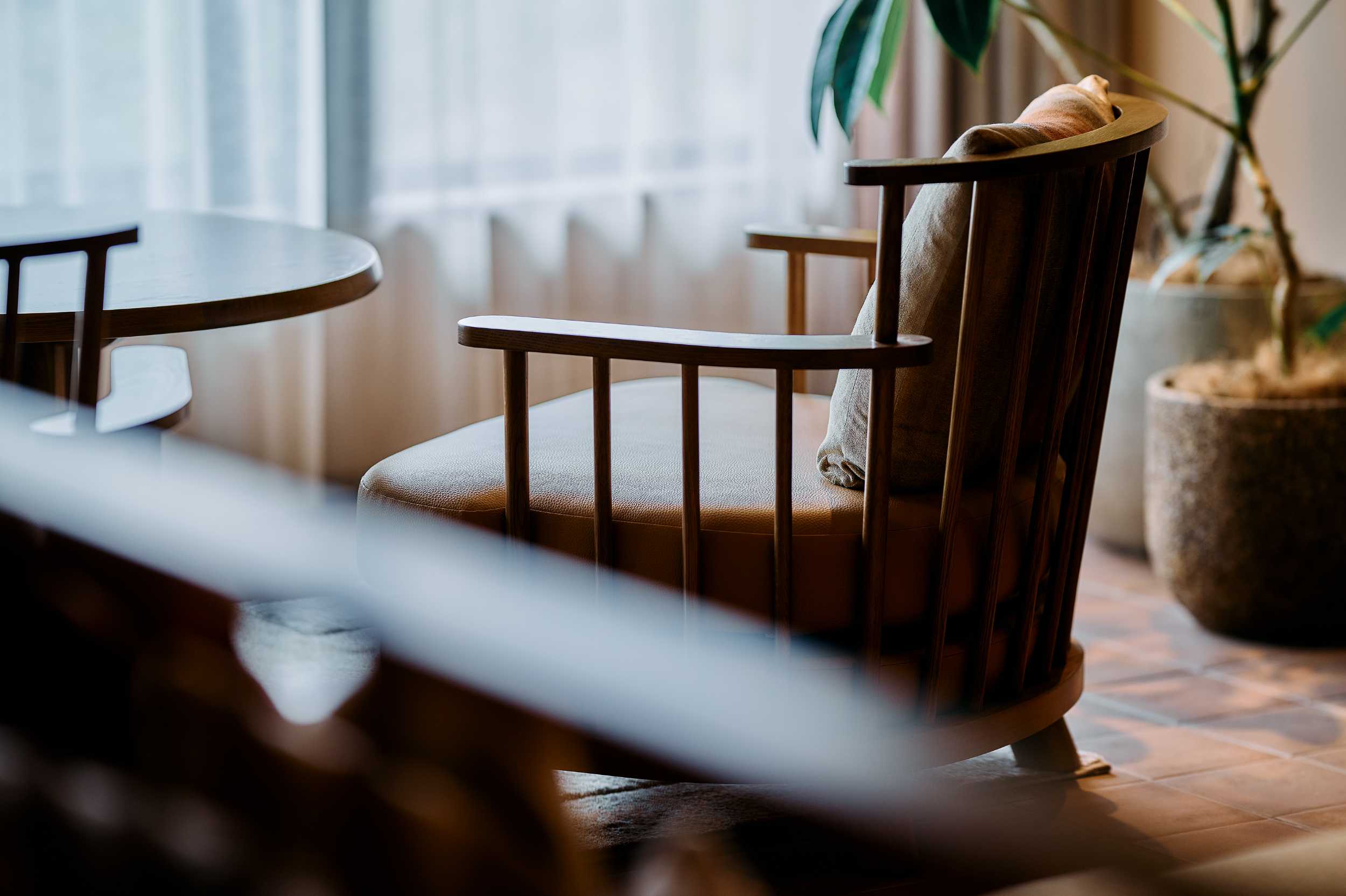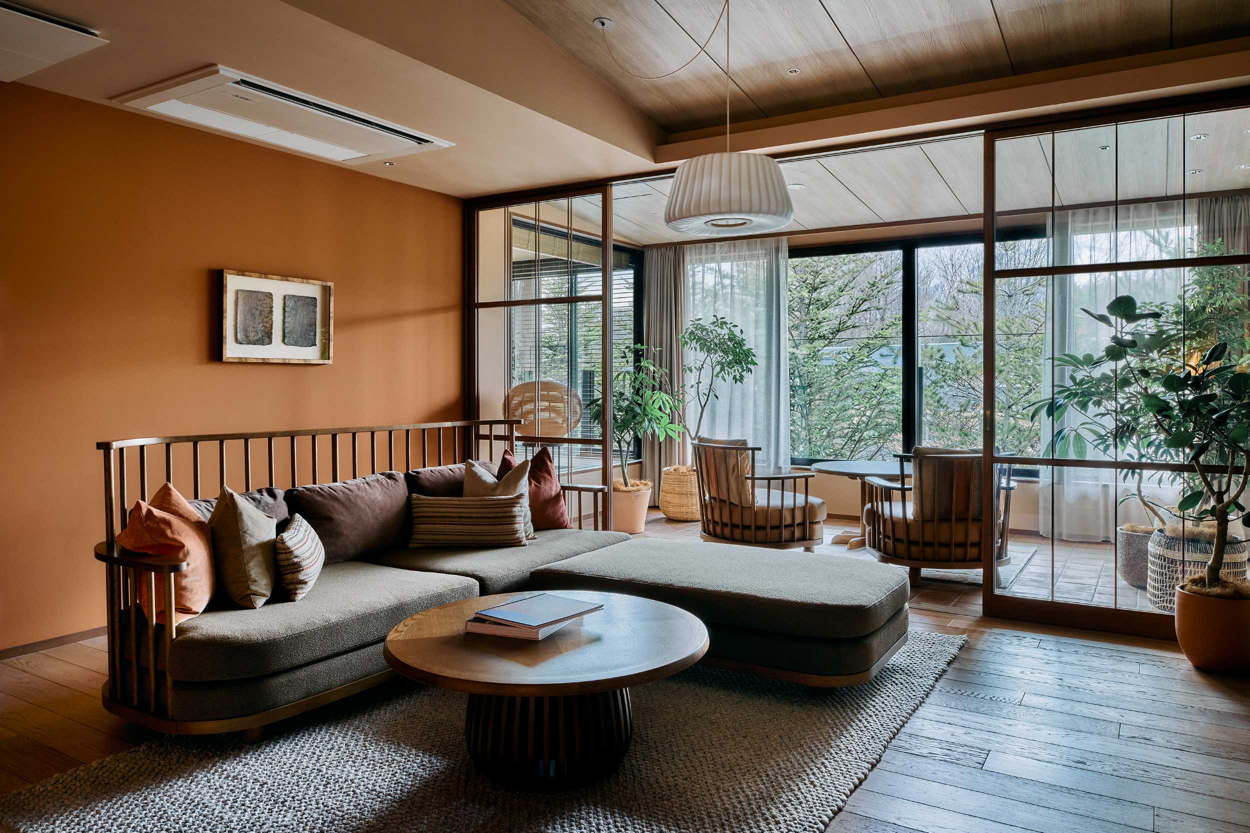 浅間山を望む「ふふ軽井沢 陽光の風」は、光と緑に包まれたリゾートです。ホテルの象徴「ふふラウンジ」には、天井から降りそそぐ陽射しと、植物たちのやわらかな緑。葉の間をすり抜けた光がテーブルを染め、ゆっくりとした時間が流れます。風をなぞったような緩やかな曲線を描くソファの稜線は、ゲスト同士の視線をやわらげ、居心地のいい距離感をつくり出しています。