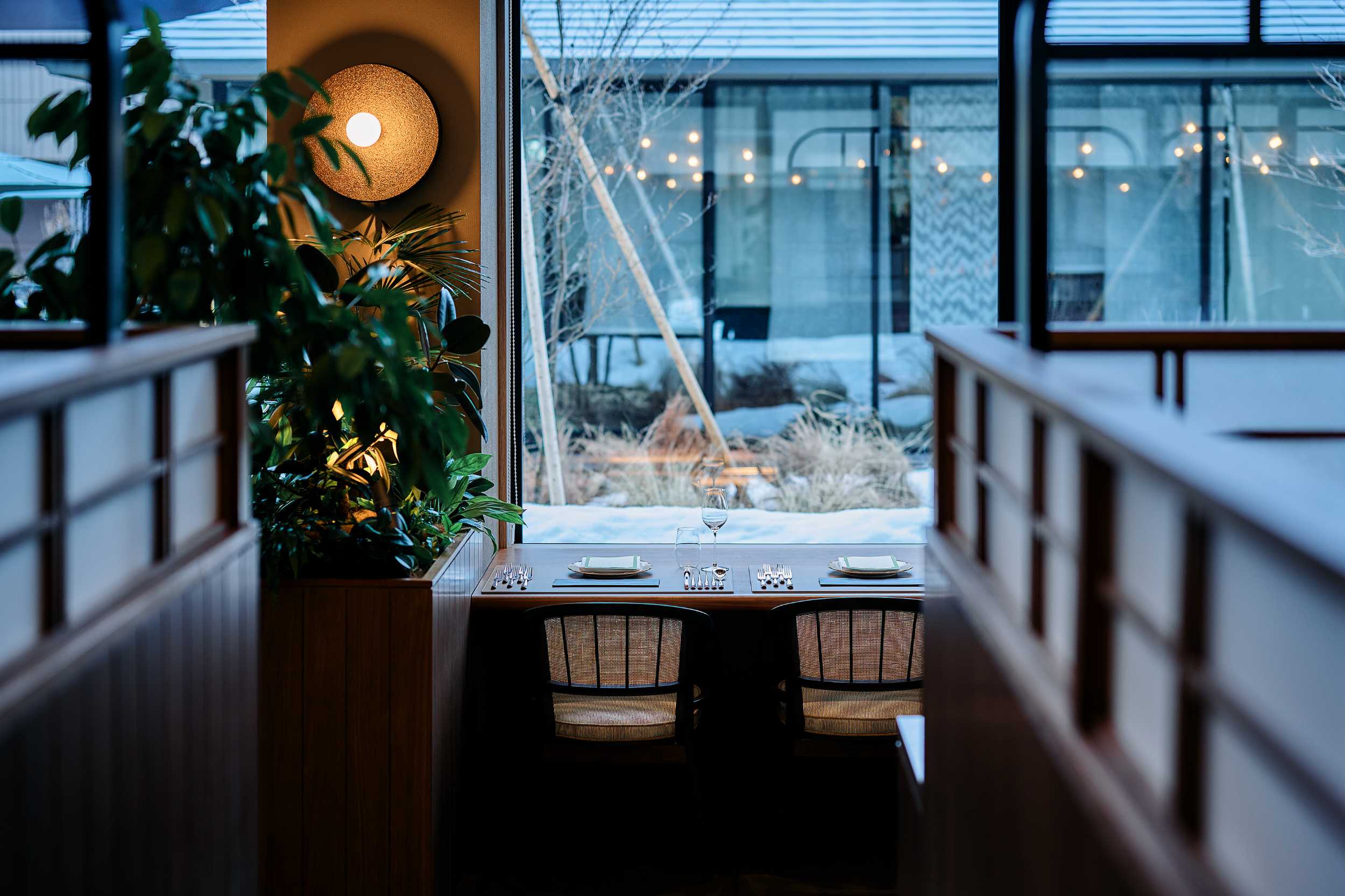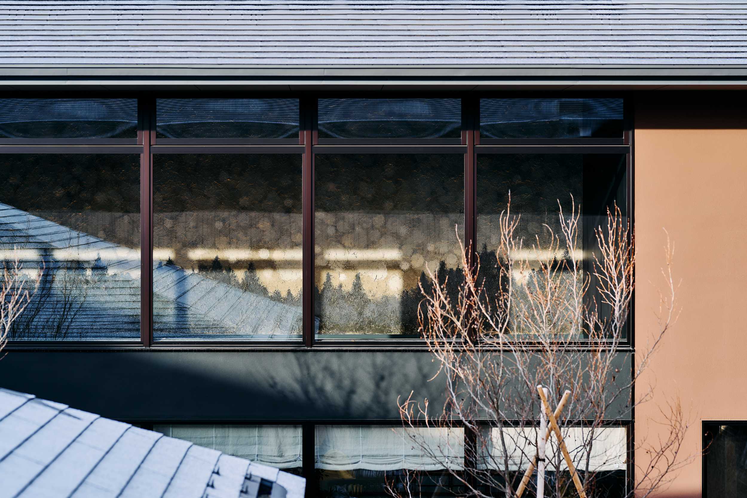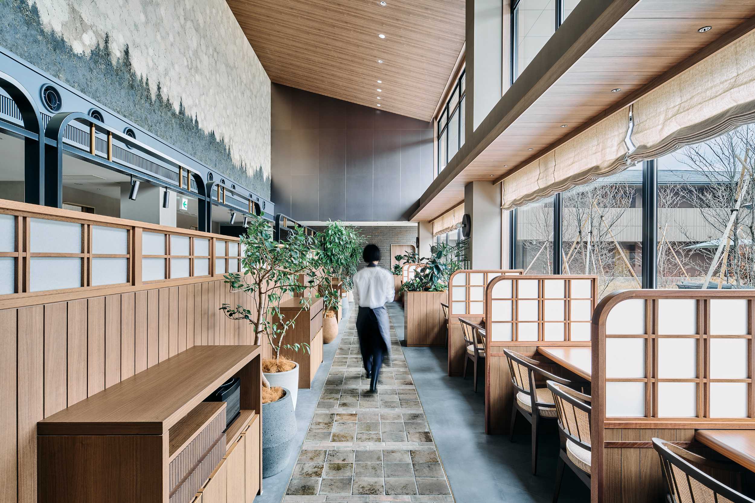 レストランもまた、ゲスト同士の距離感を大切にした計画です。大きな壁面には、ハタノワタル氏が浅間山に足を運びイマジネーションを掻き立て、和紙のキャンバスにその地の土を練り込んだ顔料を用い森林と陽光を表現しました。