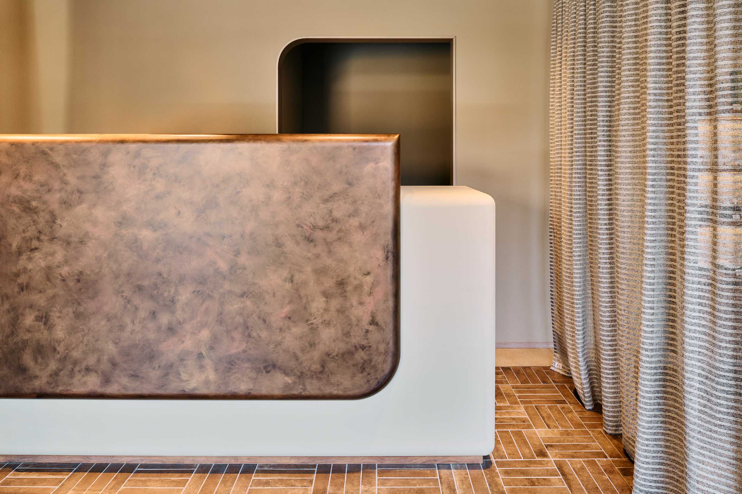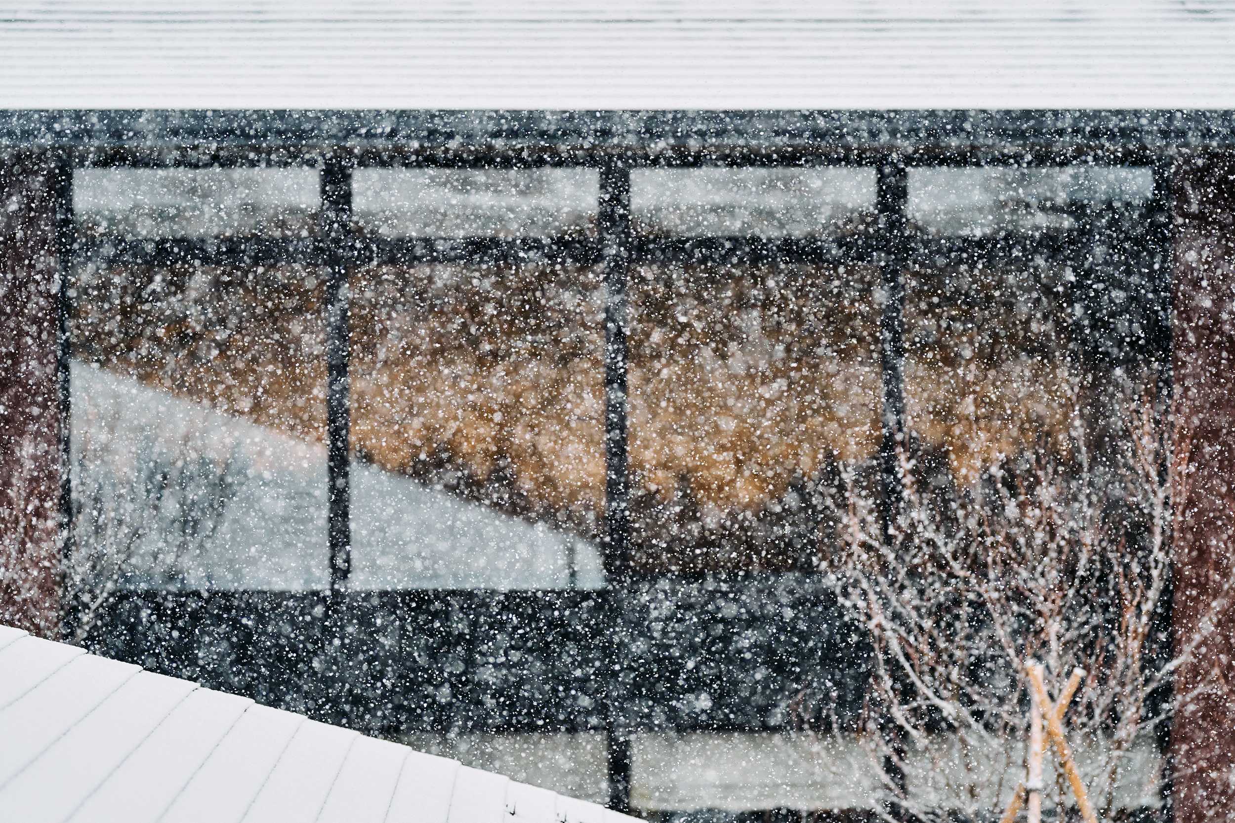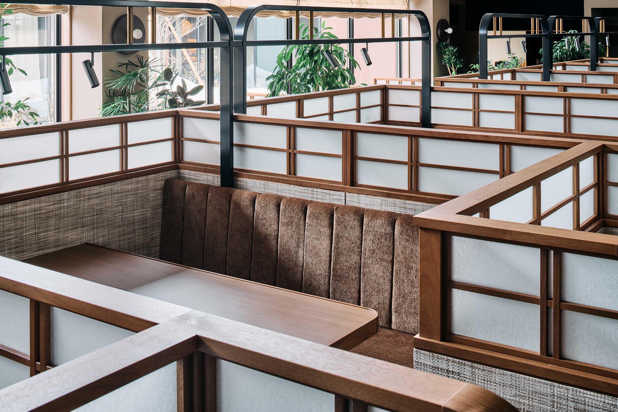 レストランもまた、ゲスト同士の距離感を大切にした計画です。大きな壁面には、ハタノワタル氏が浅間山に足を運びイマジネーションを掻き立て、和紙のキャンバスにその地の土を練り込んだ顔料を用い森林と陽光を表現しました。