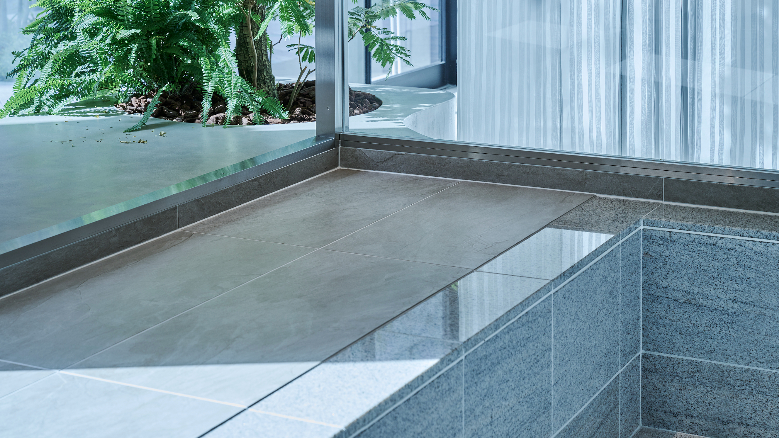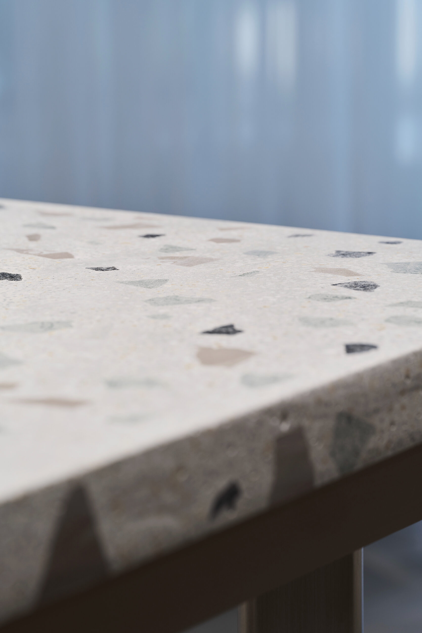 このプロジェクトでは、ユニットバス製造時に余剰となったタイルを再利用し、テラゾーテーブルに転用。