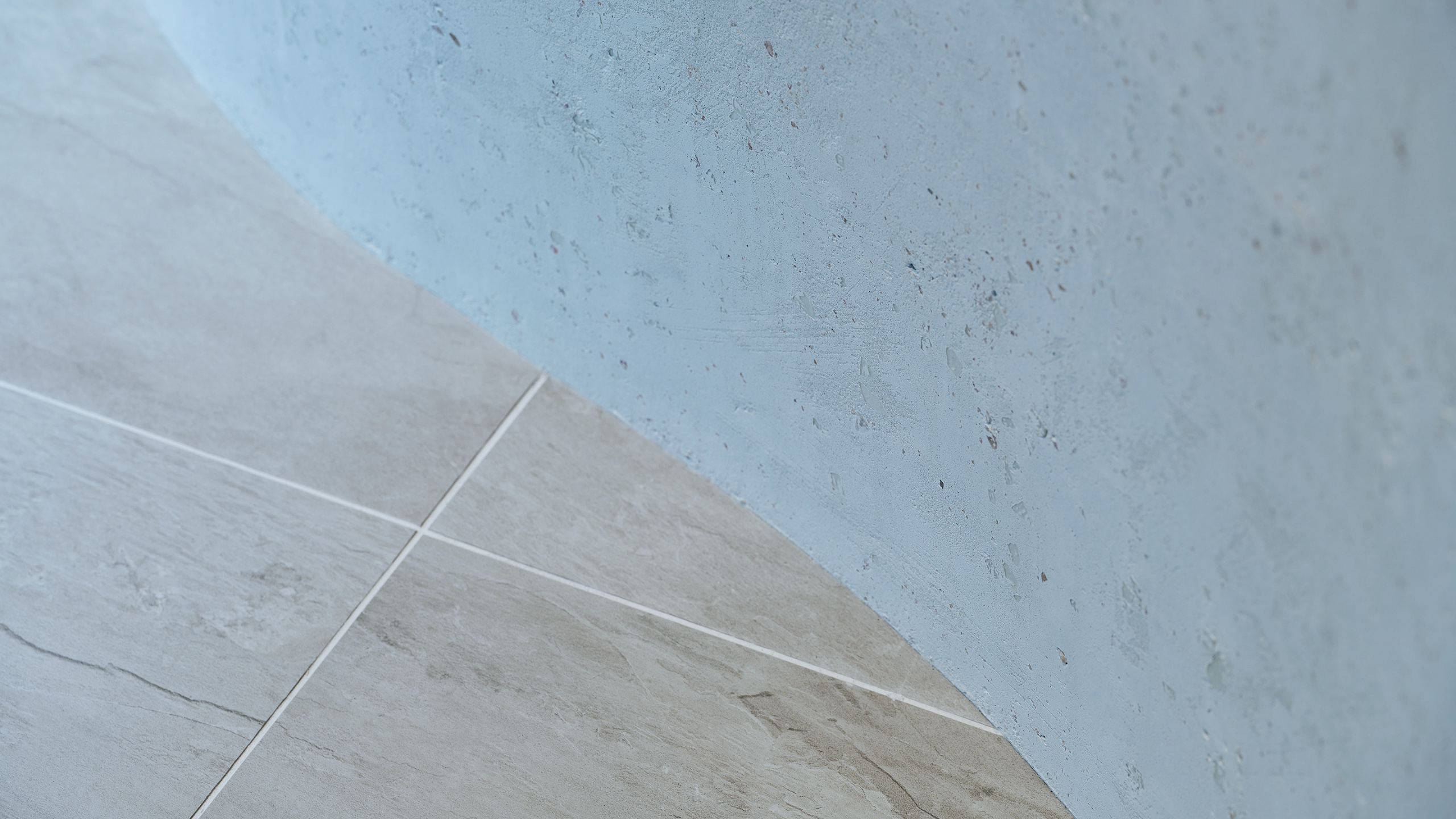 また、クライアントの別事業である食器の原材料のロスを練り込んだ左官壁を創るなど、