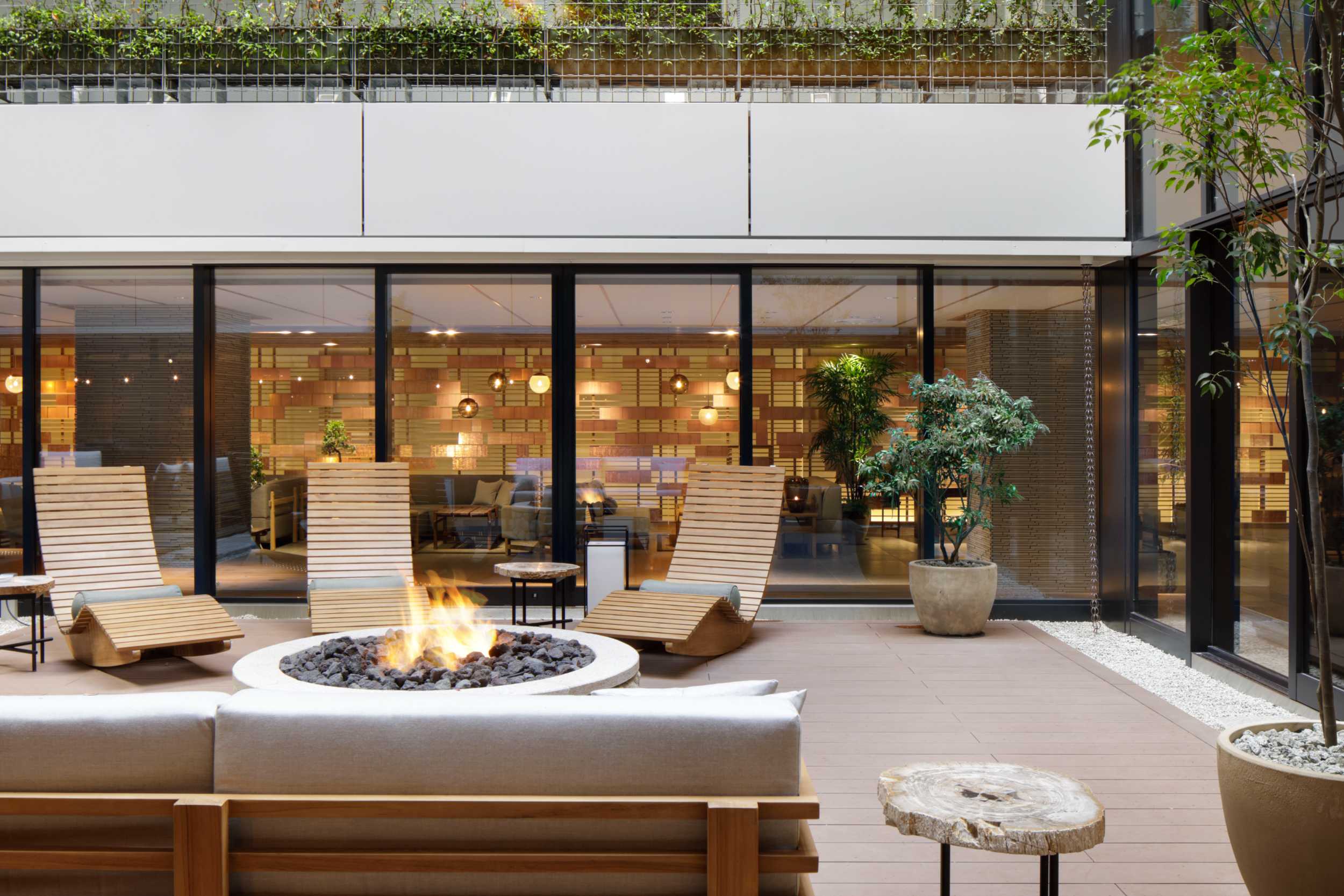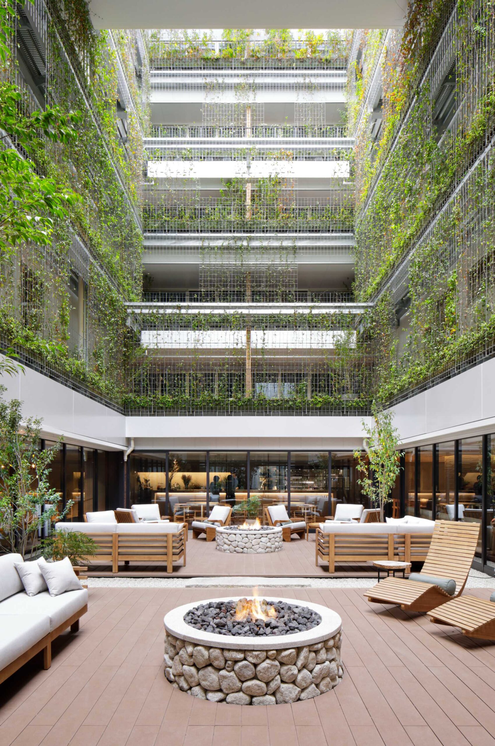 カズラの壁面緑化とファイヤーピースのコラボで、四条河原町という都会にいながら、とても静かで電線一つない空を眺めることができます。