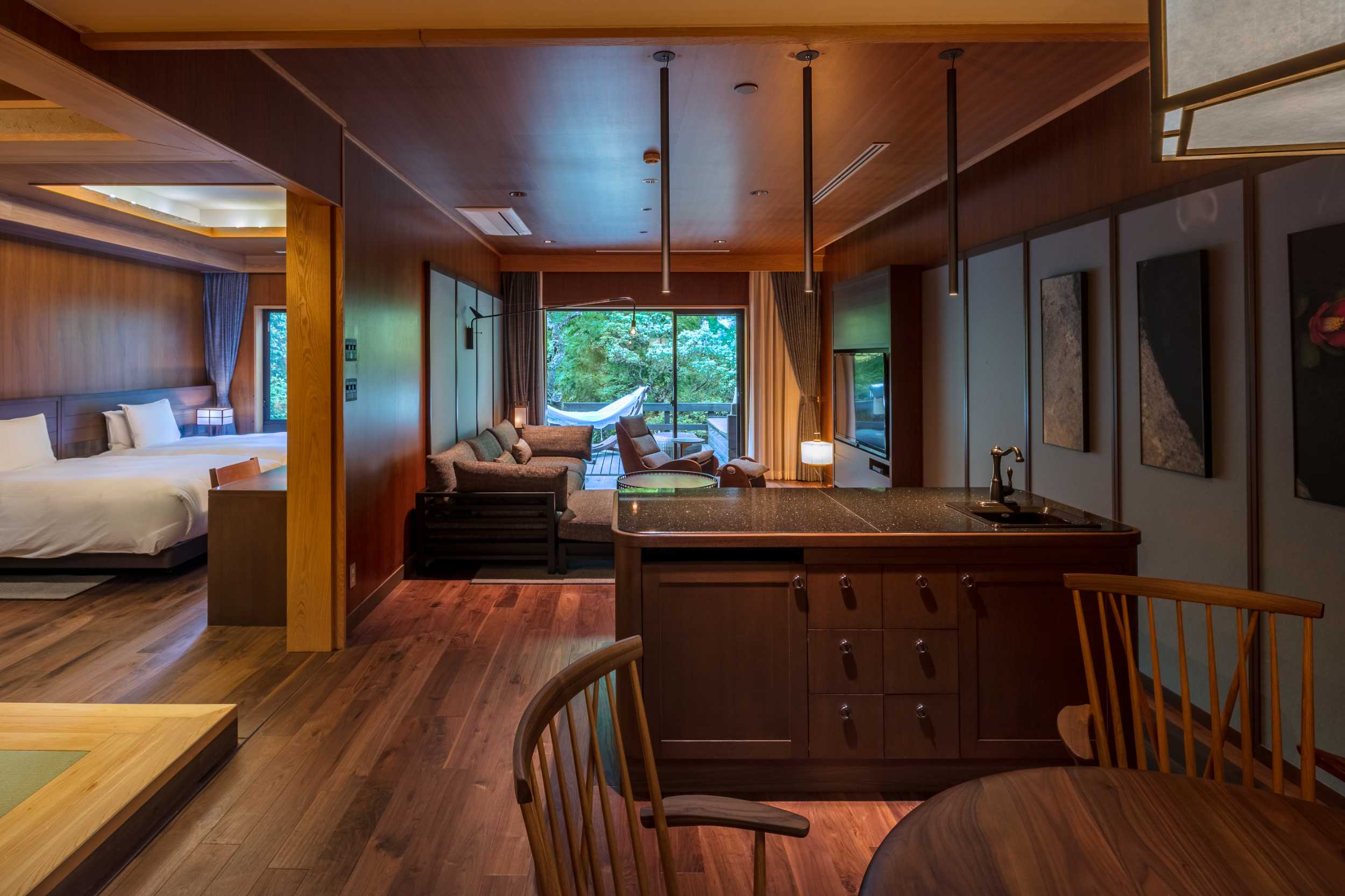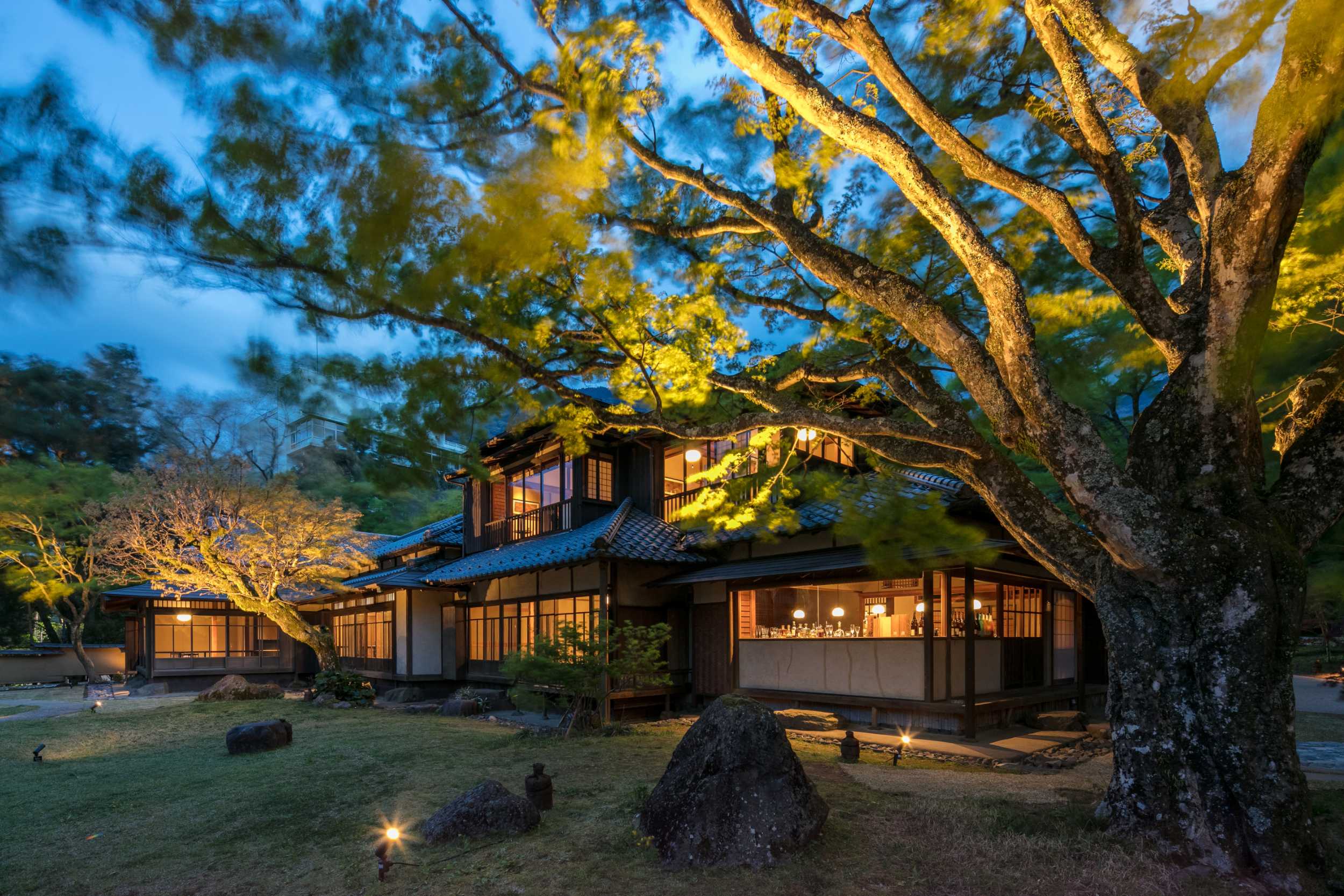 土砂災害の被害にあった部分を改修デザインさせて頂いた宿泊施設。レストランは登録有形文化財の建物を改修したもの。