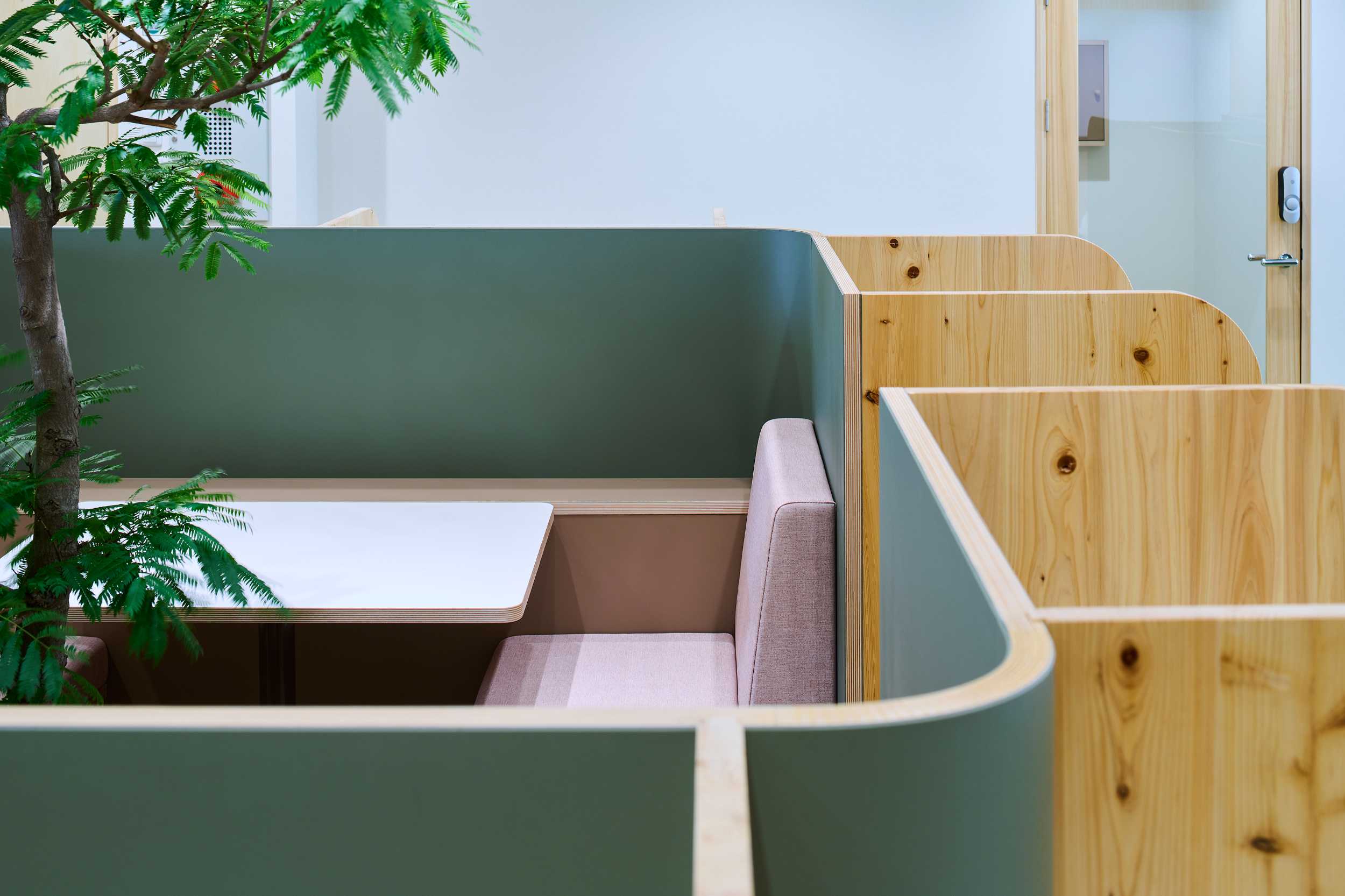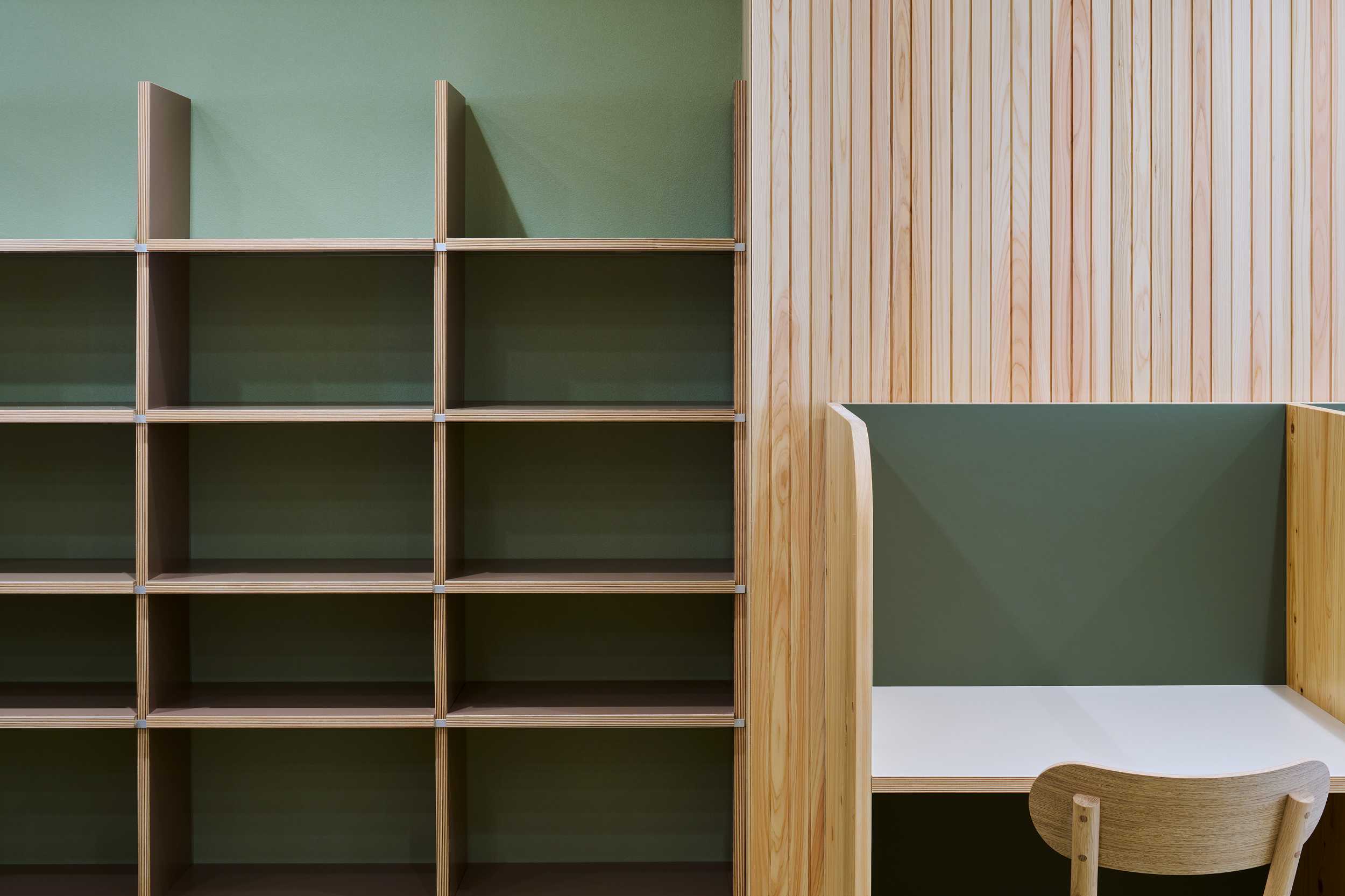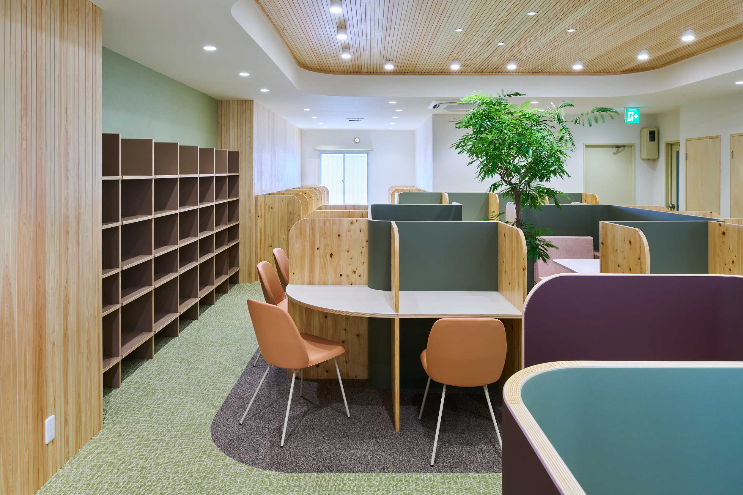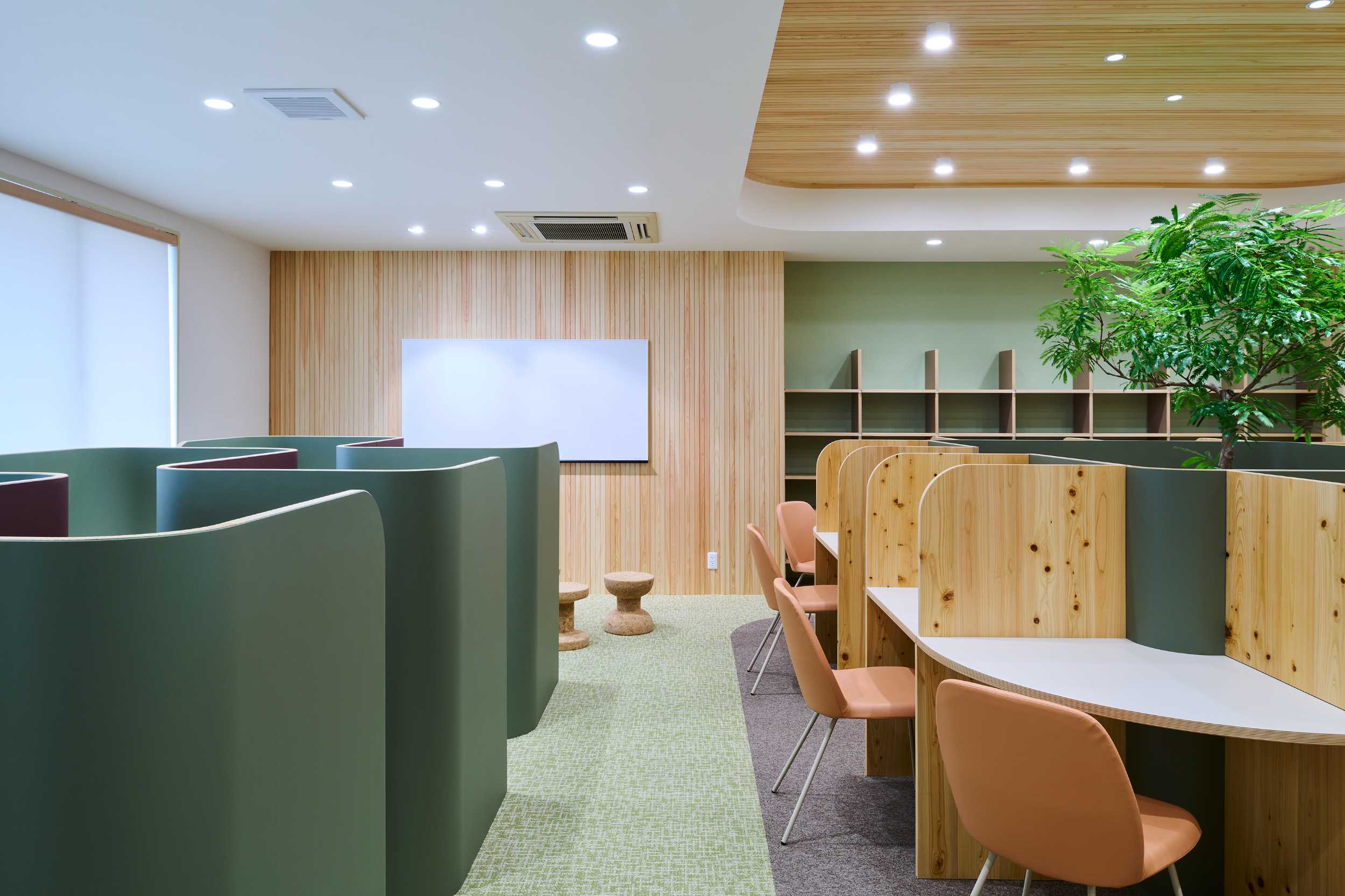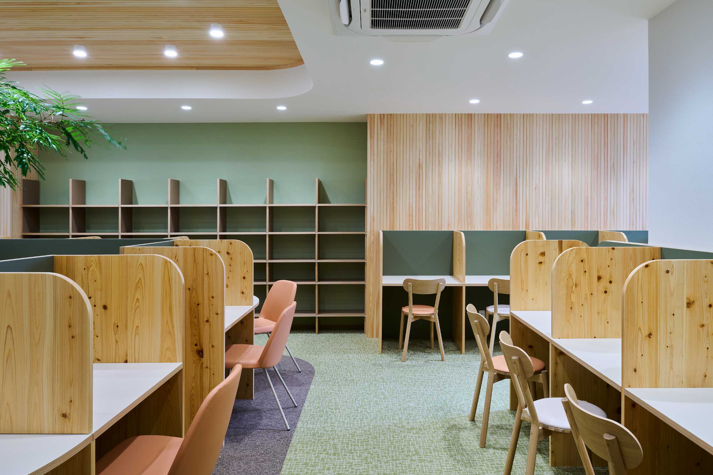 学習塾の自習室のデザインを担当しました。従来の自習室はパーティション付きの個人ブースが整然と並ぶ、いわば「孤立した学び」の場でしたが、学びにはインプットだけでなく、友人同士で教え合い、アウトプットすることで理解を深めるプロセスも重要です。本計画では、集中できる席と、自然にコミュニケーションが生まれる中央テーブルや多様なシーティングを組み合わせ、「少しの隙」を感じられるレイアウトとしました。また、空間には奈良県産の杉や檜を用い、地域の素材がもつ温かみと香りが、学ぶ時間をやさしく包み込む環境をつくり出しています。コロナ禍のため全席に着脱式パーティションを設けていますが、将来的には学生たちが垣根なく集い、互いに学び合う風景が生まれることを期待しています。