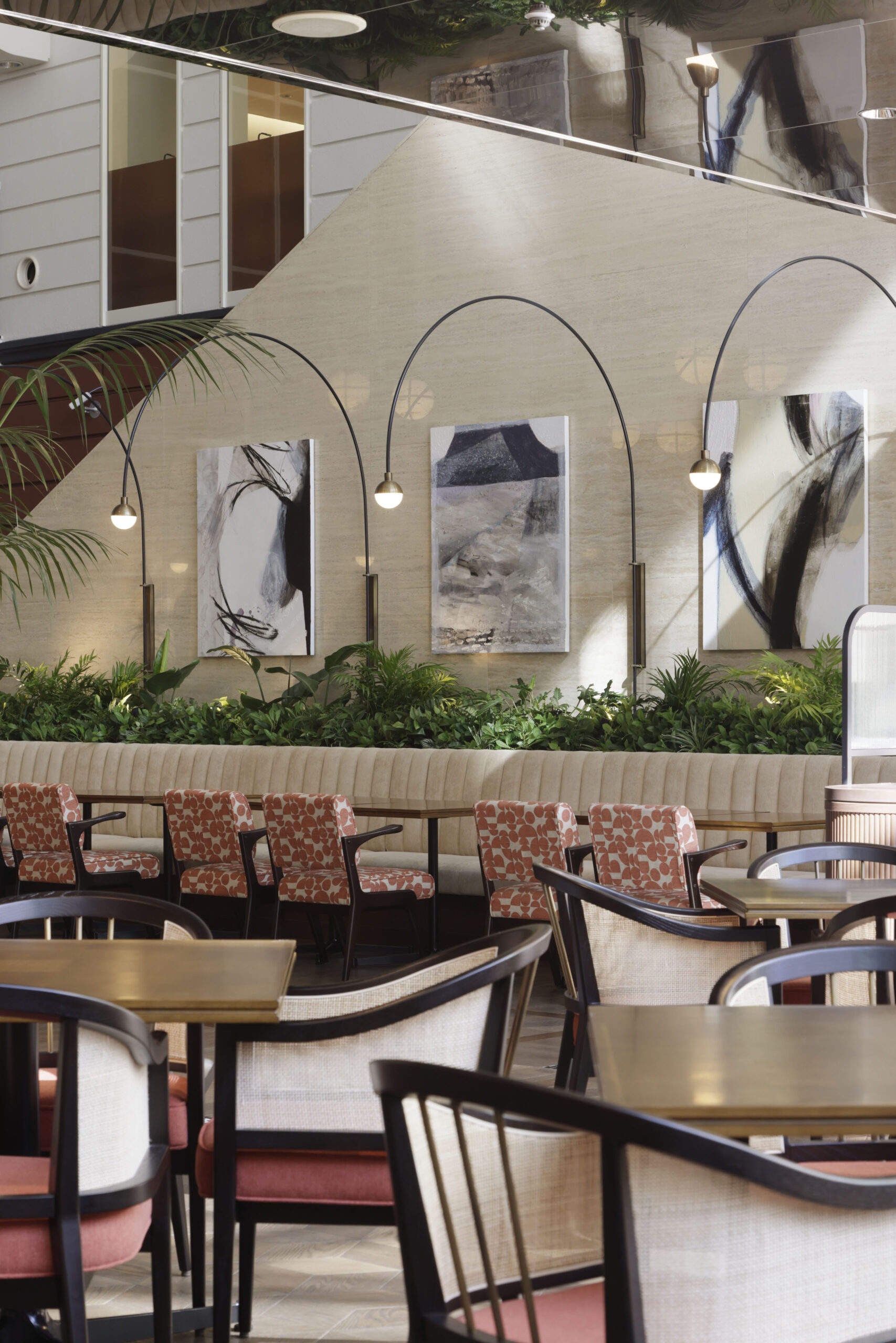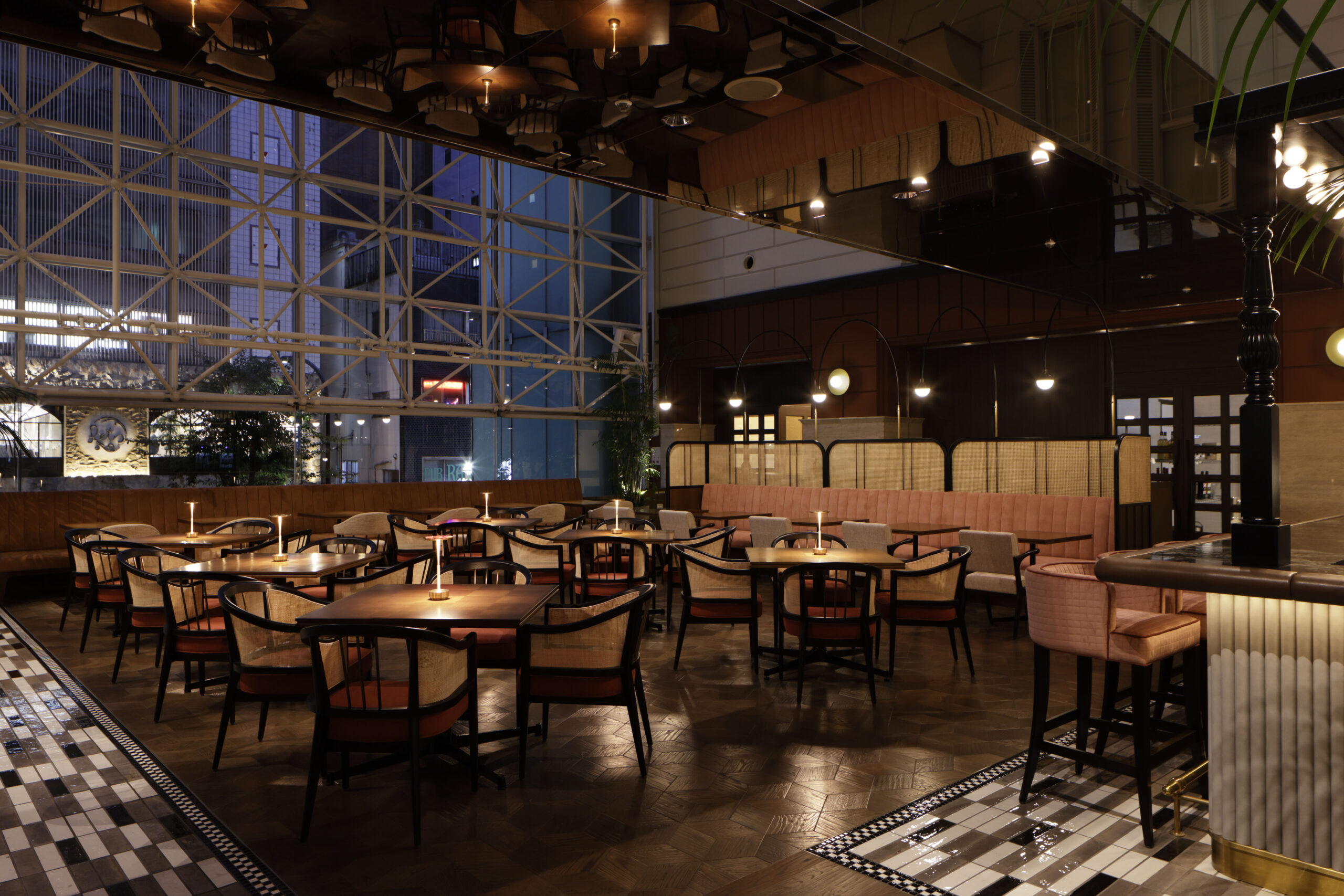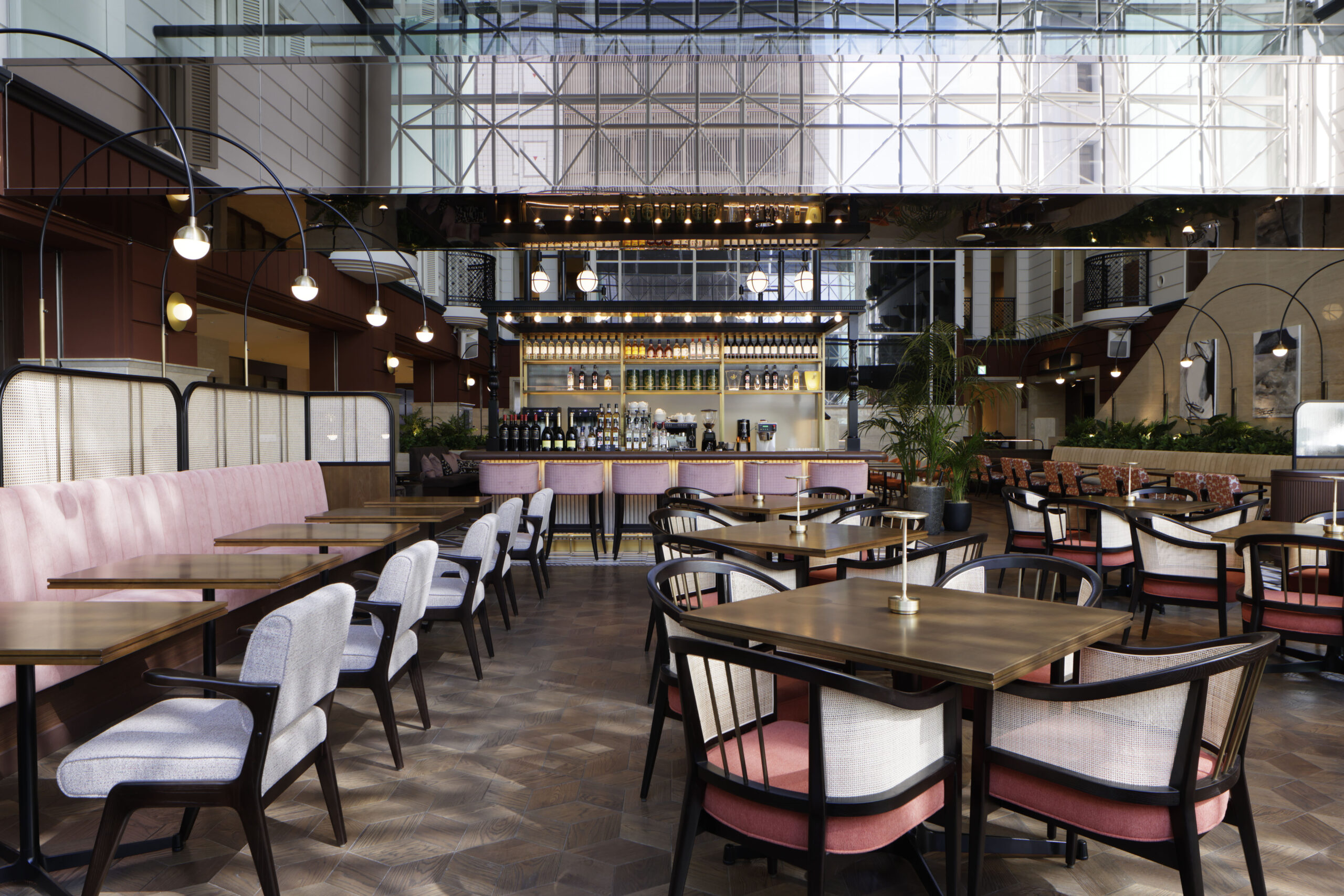 オールデイダイニングとして心地良いレストランにするために、できるだけ空間の重心を下げるべく照明の形状や、床壁天井のトーン&マナーを慎重にデザインしました。