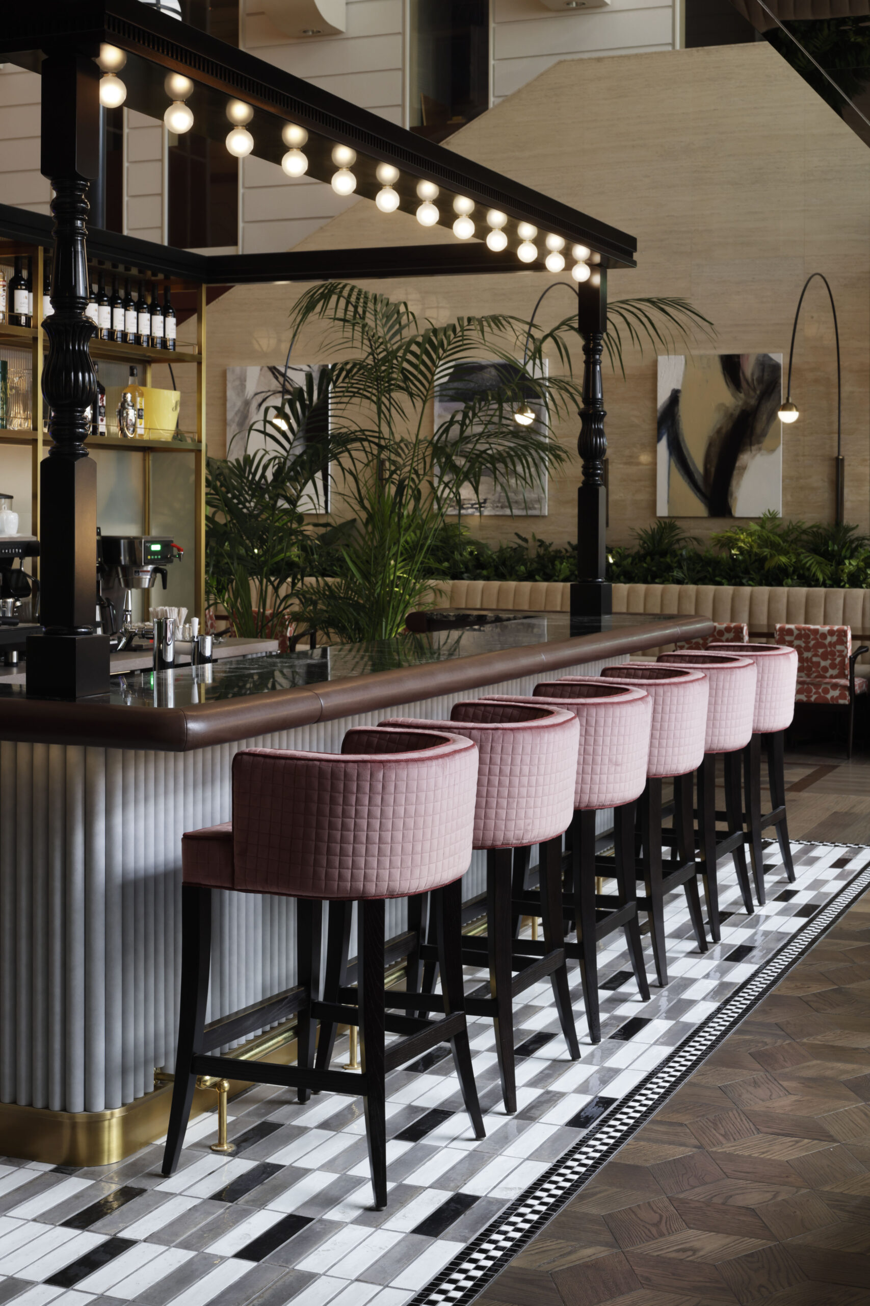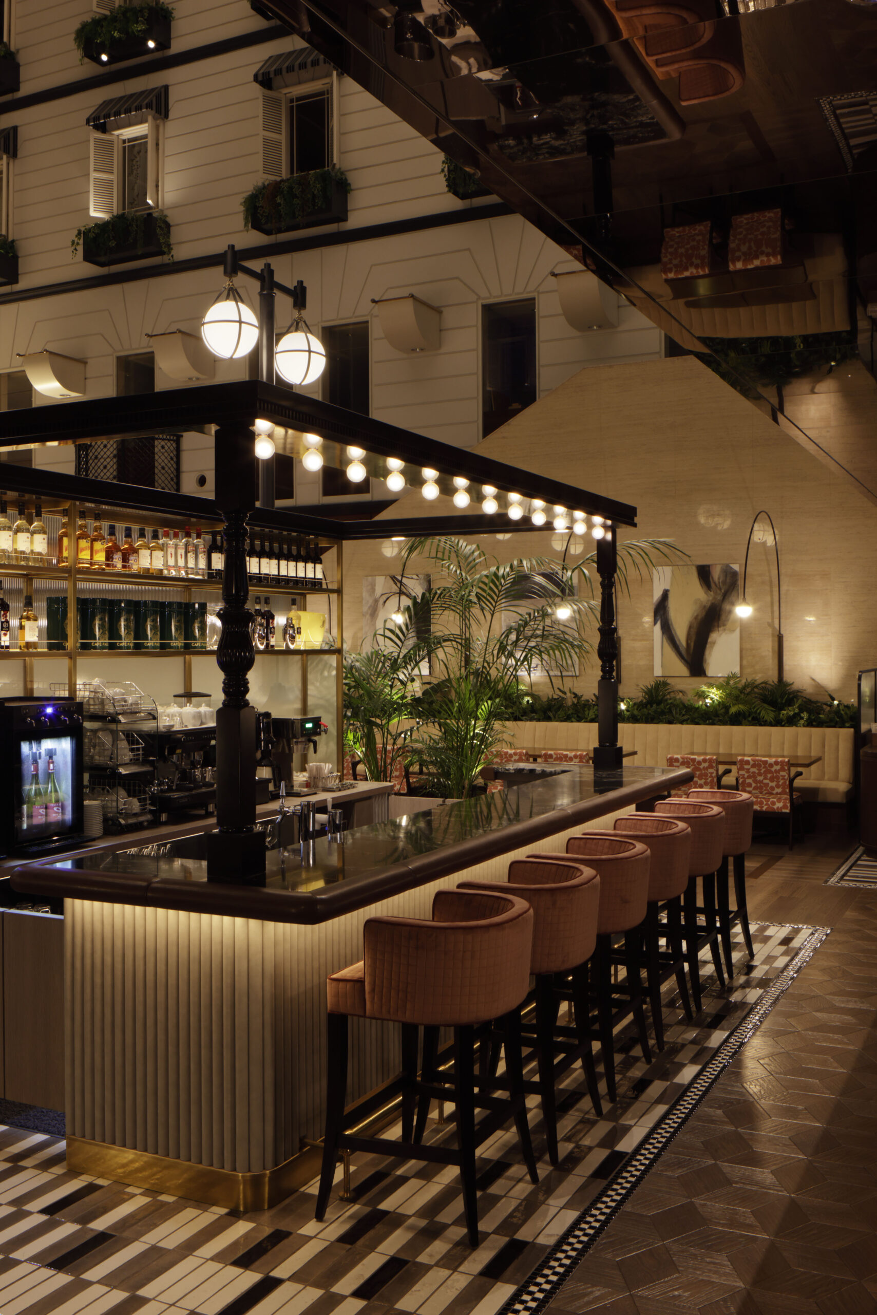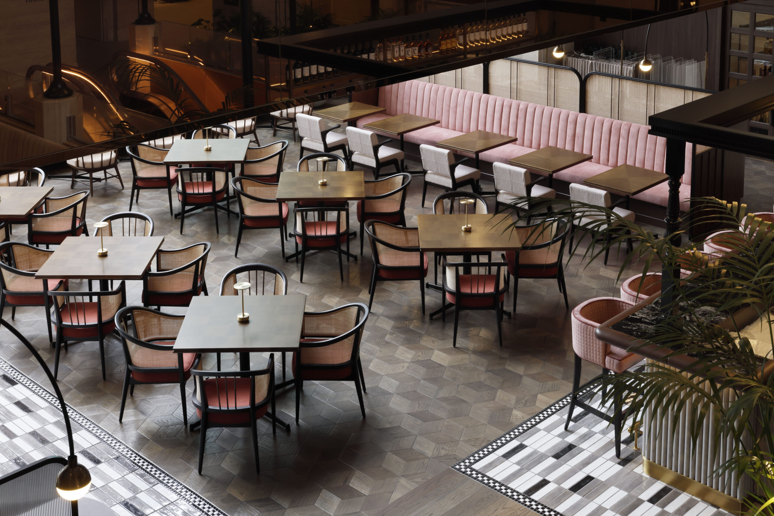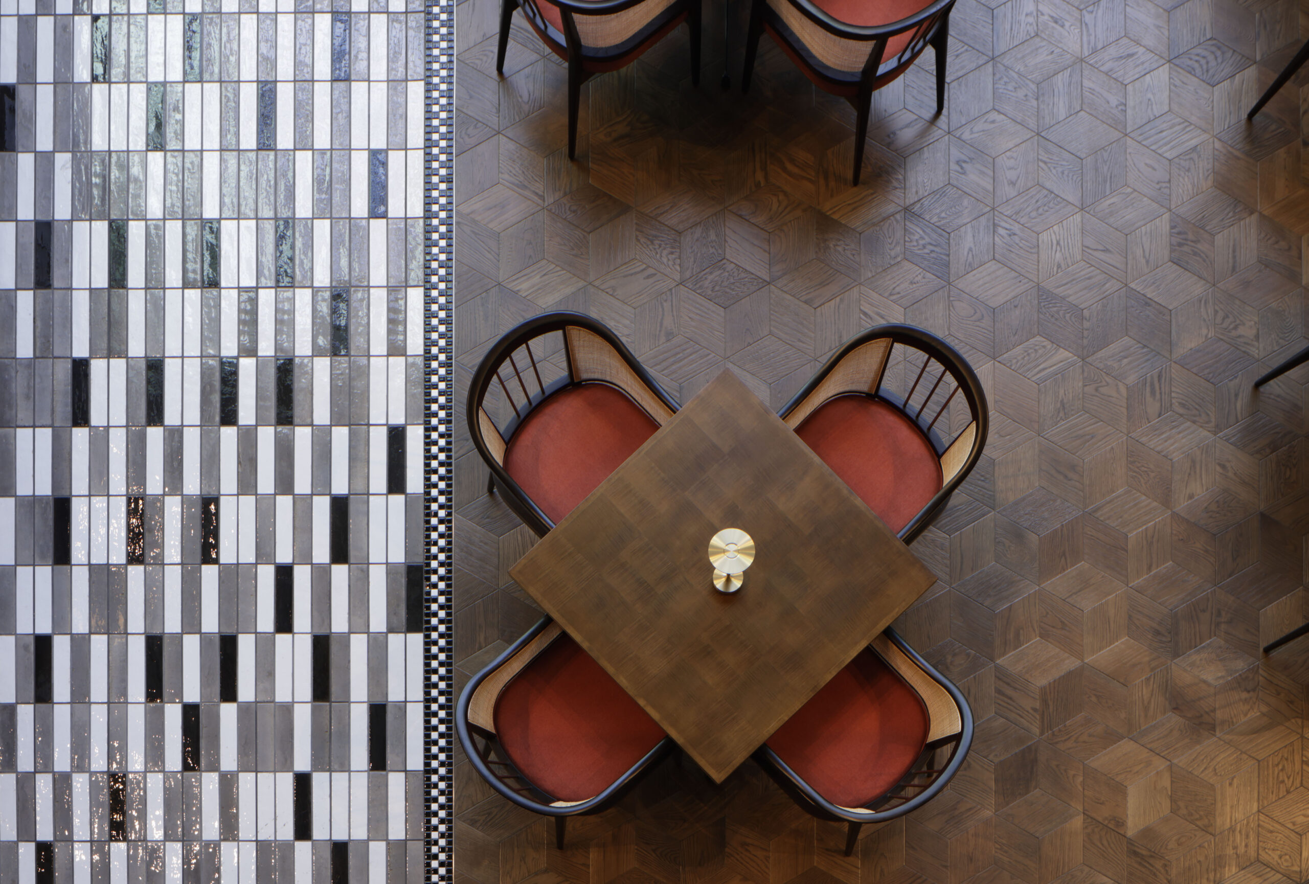 オールデイダイニングとして心地良いレストランにするために、できるだけ空間の重心を下げるべく照明の形状や、床壁天井のトーン&マナーを慎重にデザインしました。