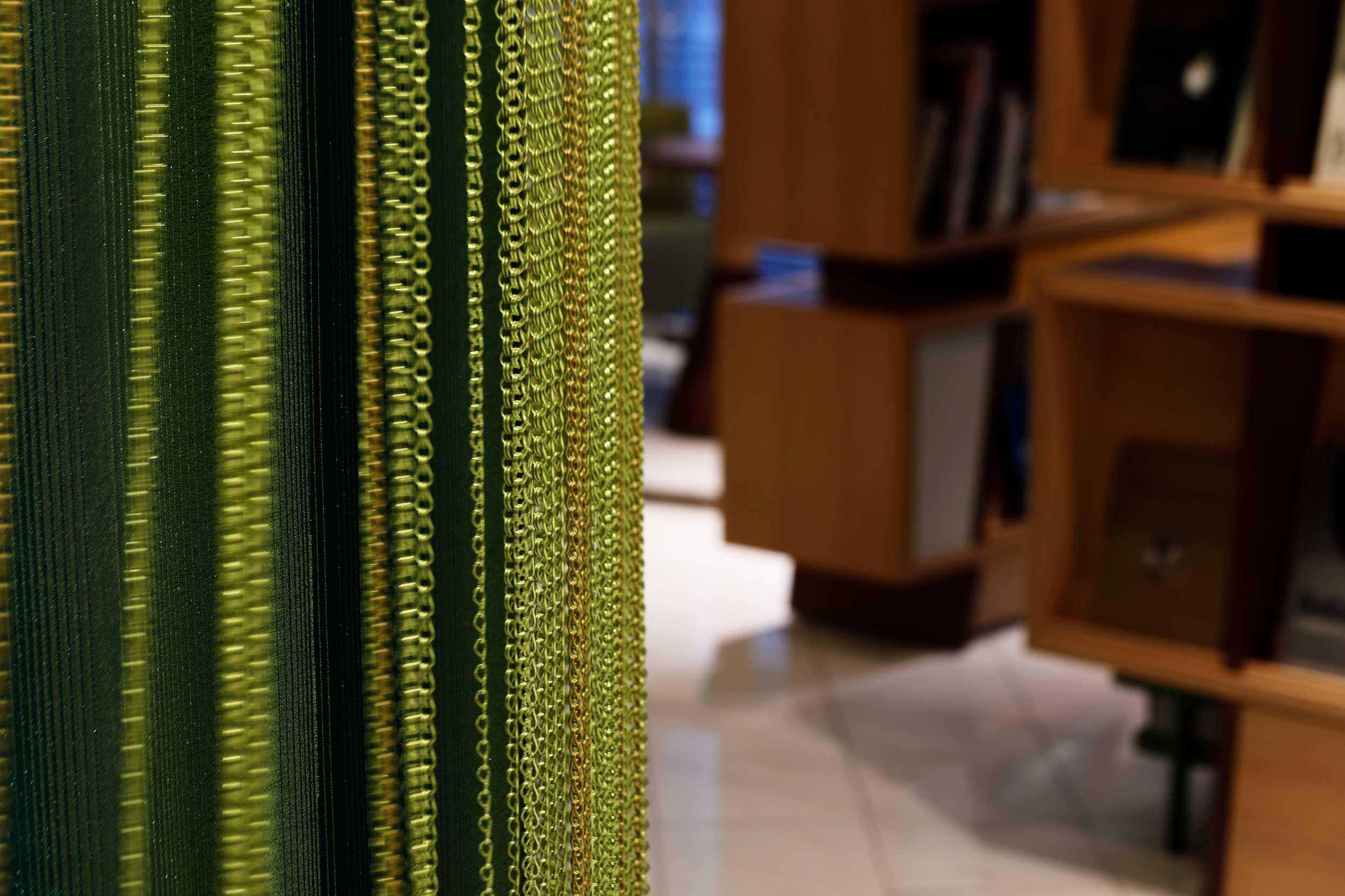 それを表現するために、試行錯誤の結果、オリジナルのグラデーション柄の西陣織クロスの前に、2色の電解着色のアルミチェーンを吊るしました。チェーンの輪の隙間から金糸と銀糸を織り込んだグリーングラデーションがチラチラと見えることで、幾つものレイヤーがあるような錯覚を抱きます。まさに京都嵯峨野の竹林に迷い込んだかのよう。