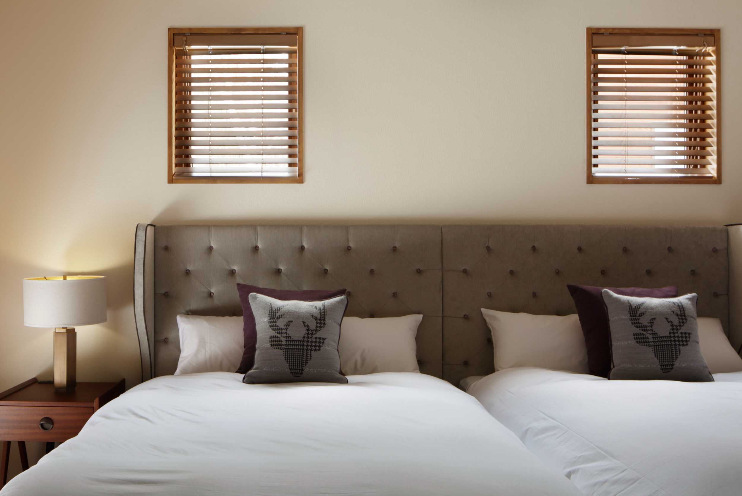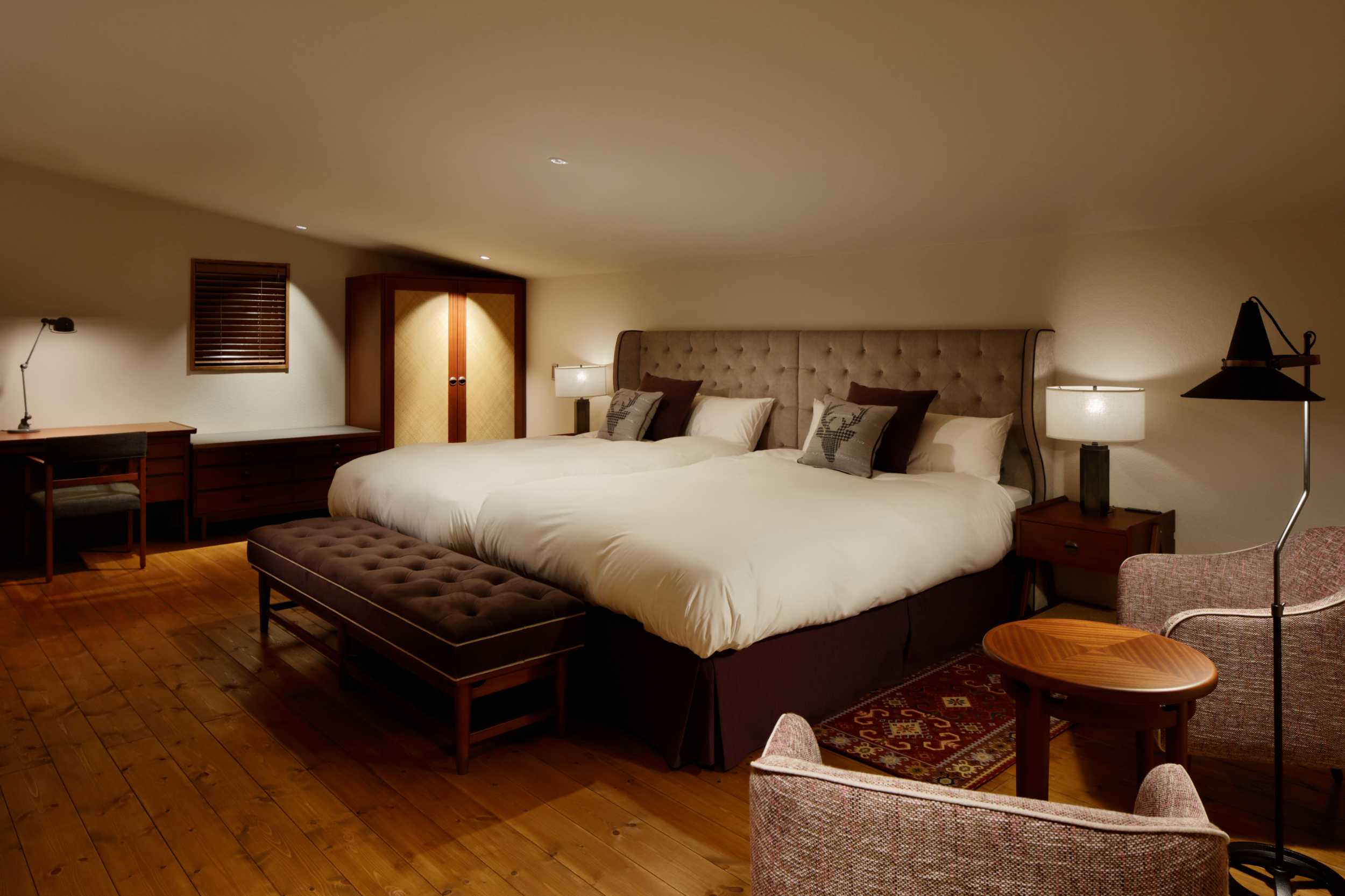 函館から車で1時間ほど、北海道駒ヶ岳を望む緩やかな傾斜地に佇む施設です。ホワイトを纏った杉を基調としたラウンジは、冬の時期には白銀の世界と繋がっているような雰囲気に。