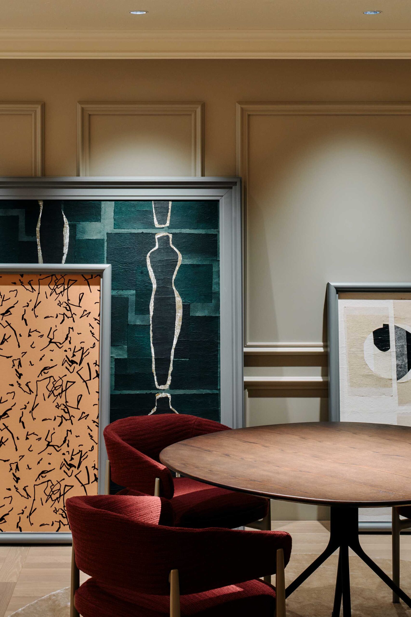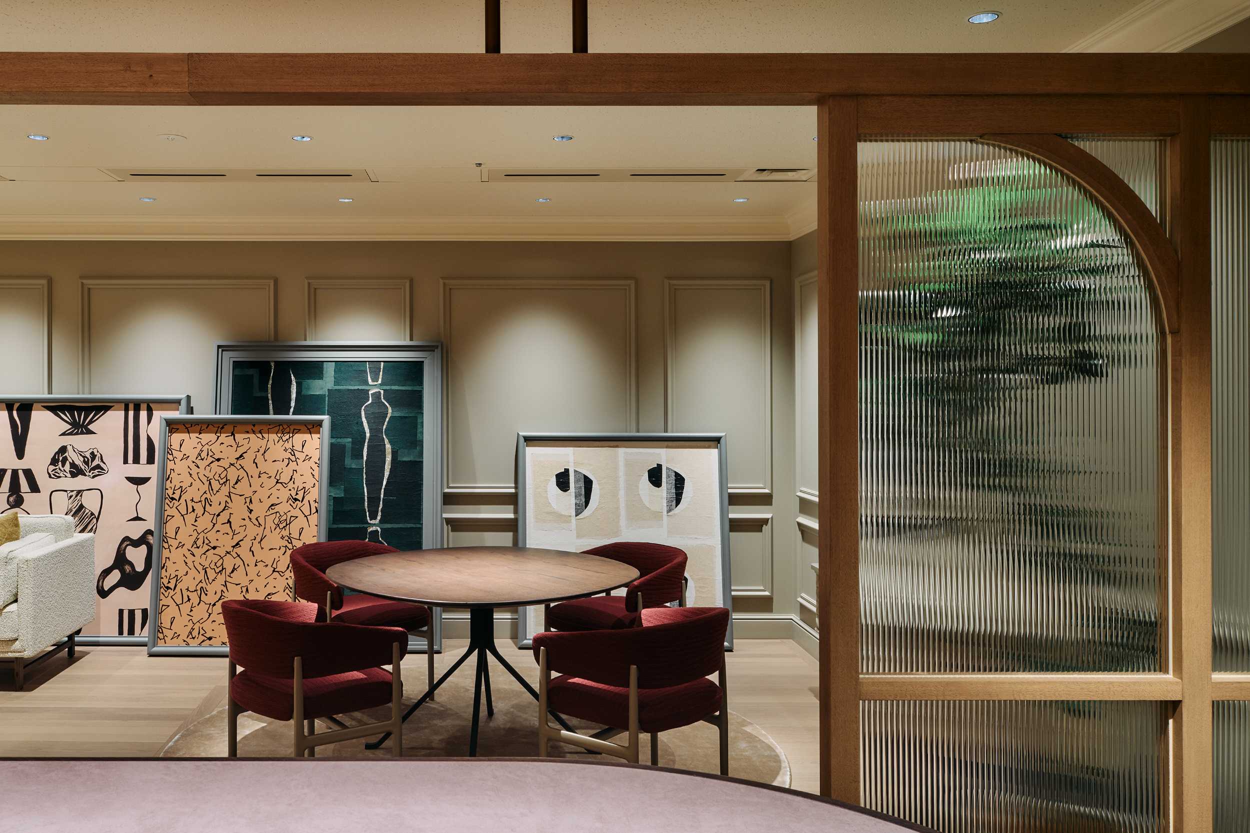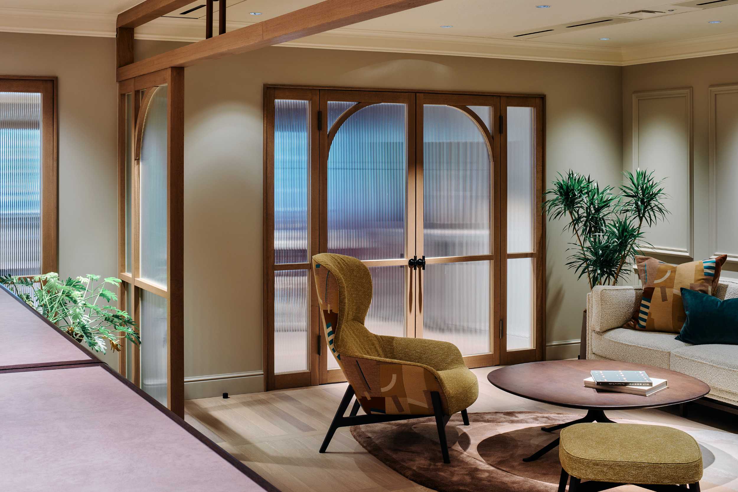 裏コンセプトは、ドラマ『エミリー・イン・パリ』。ニュートラルグレーの壁に設けたアーチゲートが奥の景色を額縁のように切り取り、モールディングやスタンドライトは同社取扱い製品で統一。@orac.officialのモールディングで作った額装には、フランス・エリティス社の壁紙を飾り、柔らかな色彩が空間に華やぎを添えます。@arflex_officialや、@stellarworks_official の家具にもマナトレーディングで扱うファブリックを設えました。光と素材が織りなす中で、働く人と集う人が自由と気品に包まれるオフィスとなりました。