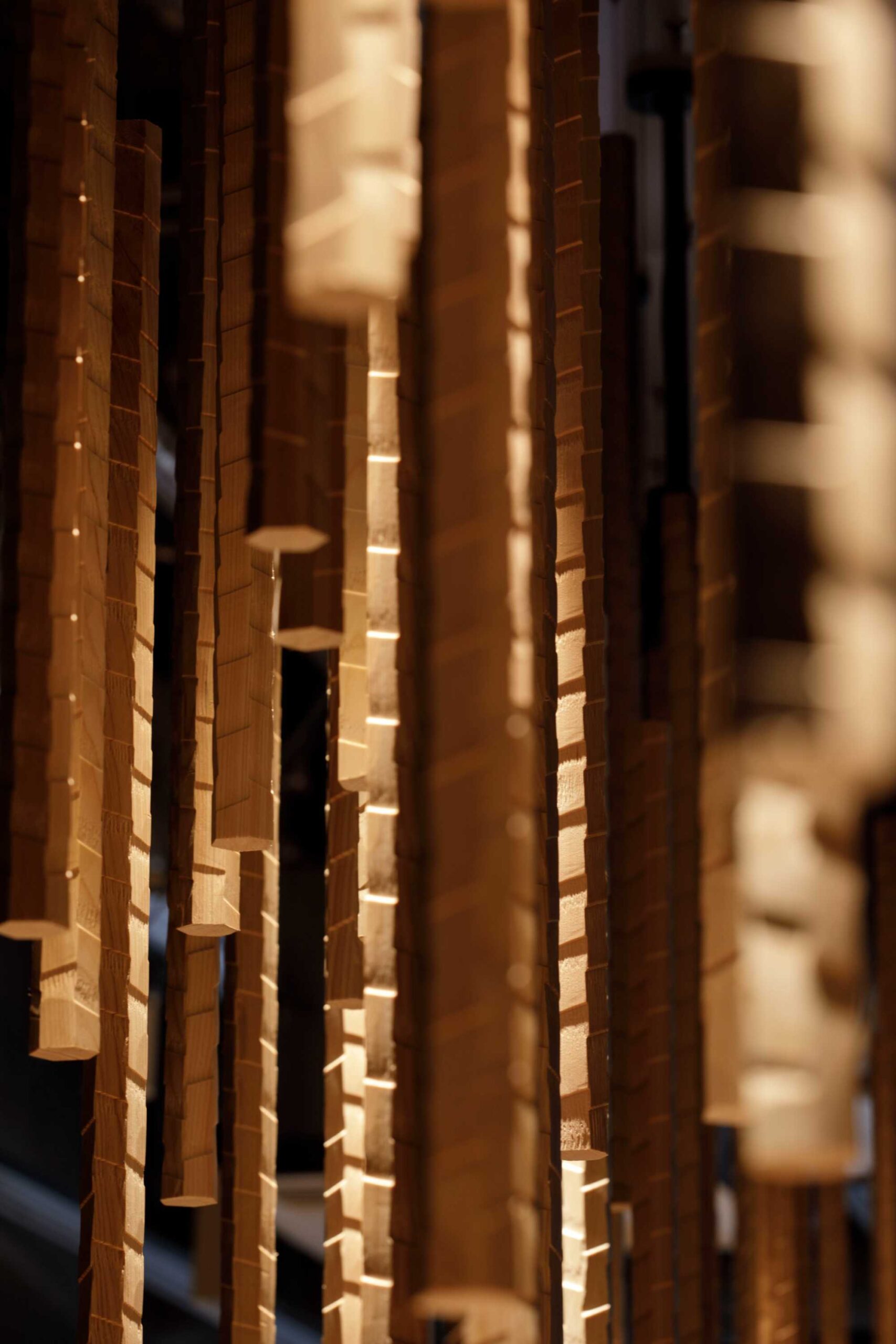 奈良県のブランドショップの2階にはTokiというレストランがあります。そこのバーカウンターには、吉野檜でつくたナグリのシャンデリアをつくりました。ナグリ(名栗)は通常は、その字のごとく栗材でつくられることが多く、その他もタモ材など広葉樹でつくられます。今回は奈良県産材にこだわることを決めて、杉や檜で色々と試しました。結果やはり木目の緻密な檜の赤身だとなんとかうまくナグリ加工ができることが分かりました。六角形のなので、光の当たりにより様々な表情を見せてくれます。