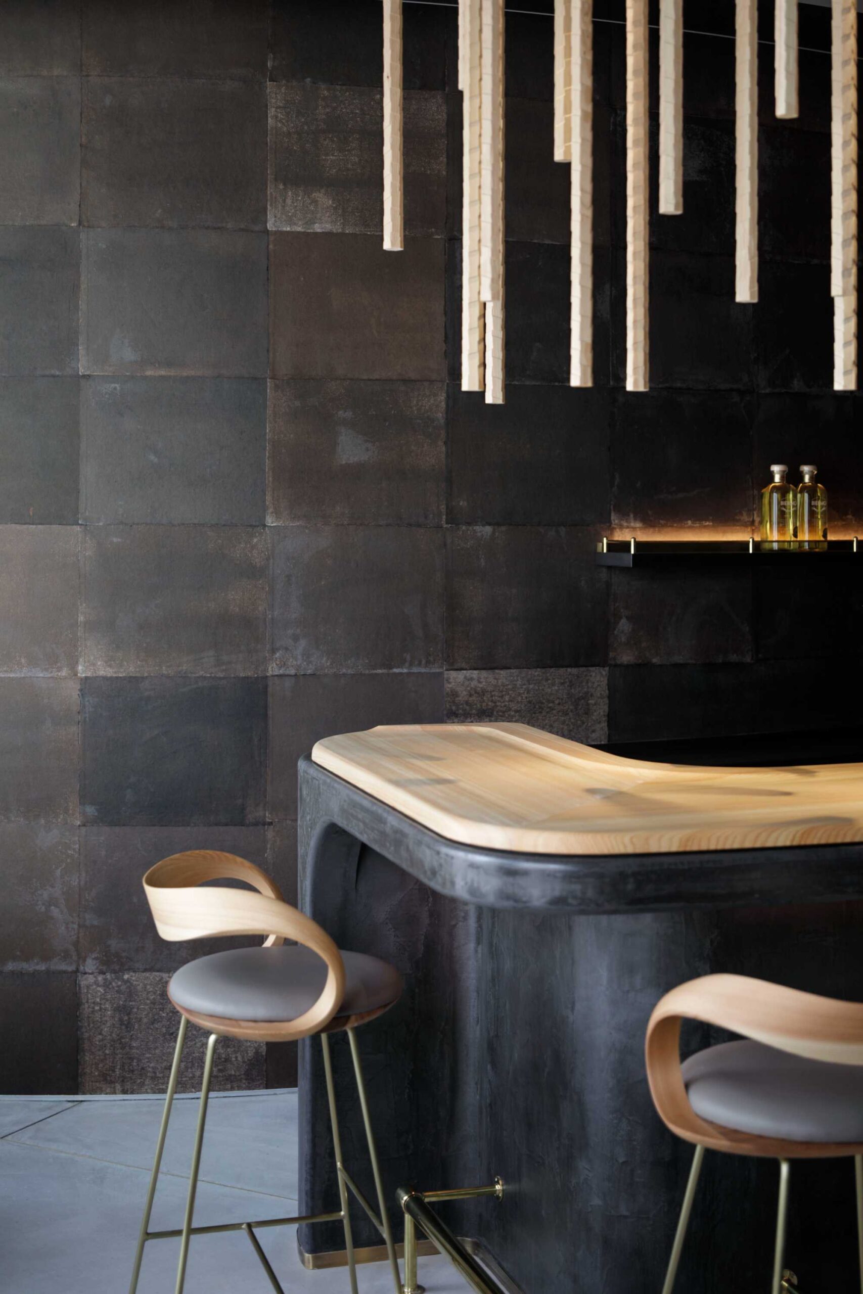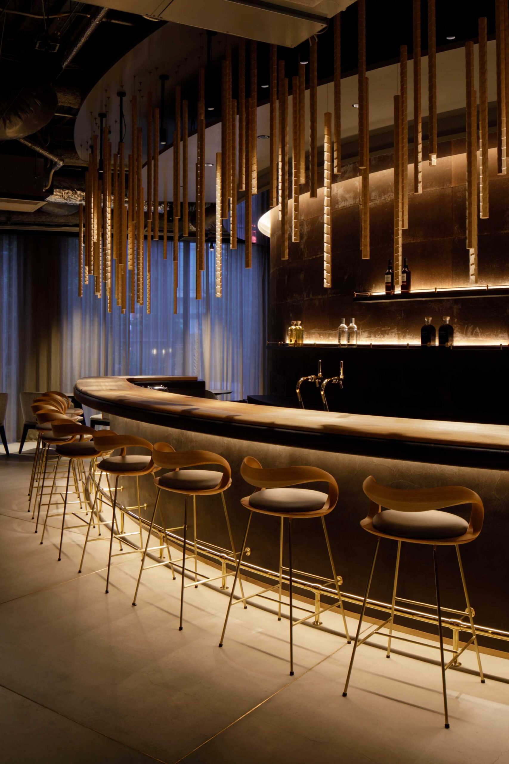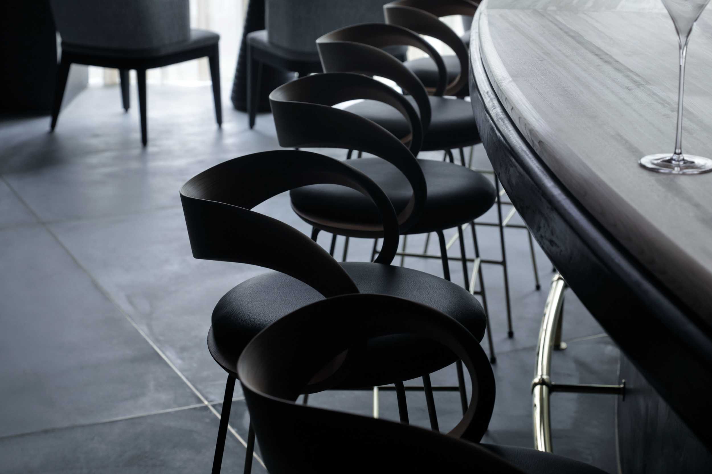 ランチやバーを気軽に楽しめるカウンター席には、奈良の木工作家studio jig の平井さんがこのお店の為にデザインしてくださったハイチェアが並びます。大切に管理された森で育った吉野杉は木目が整然とキメ細かく、これほどまでの美しい曲げを実現してくれています。