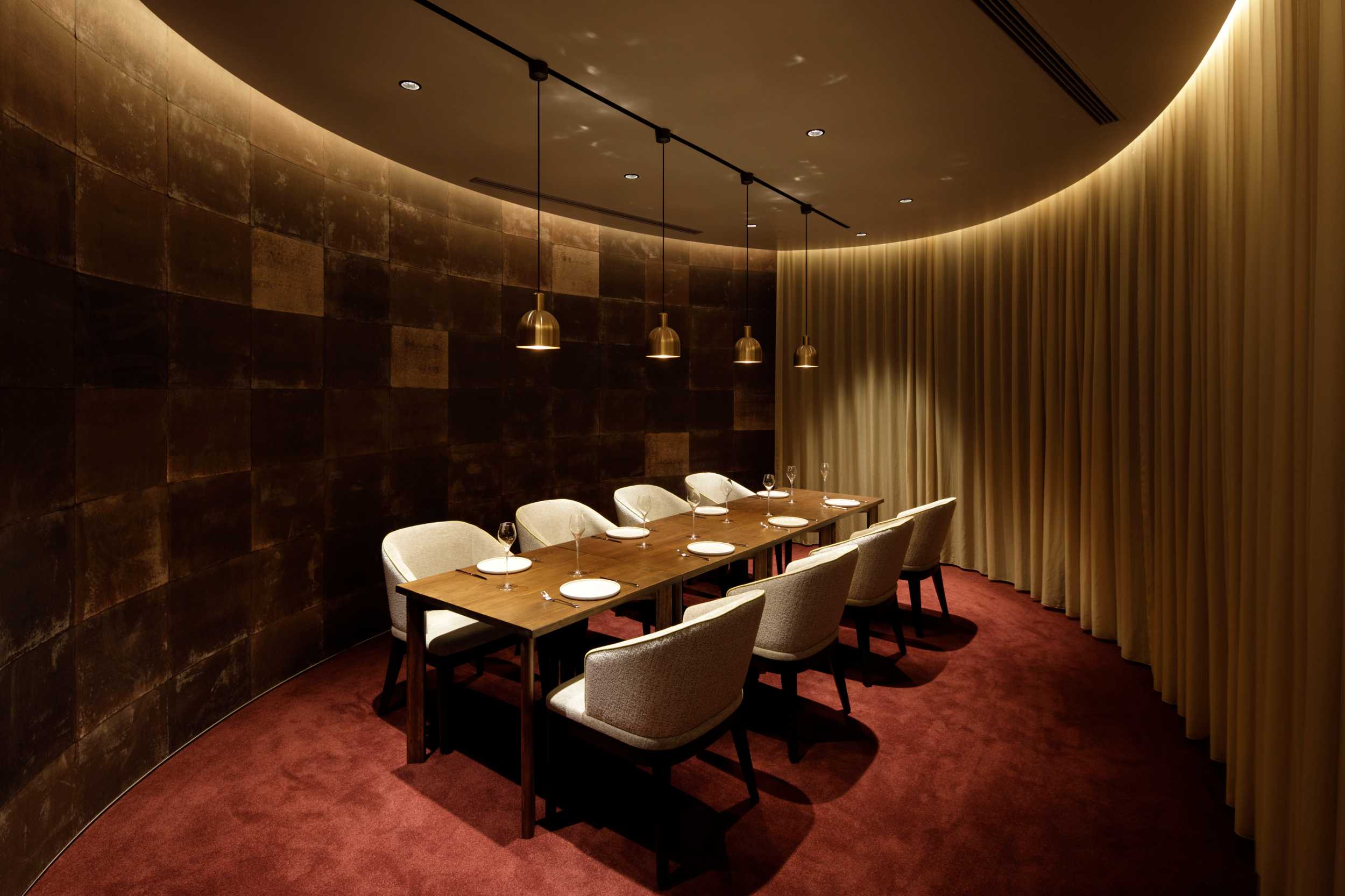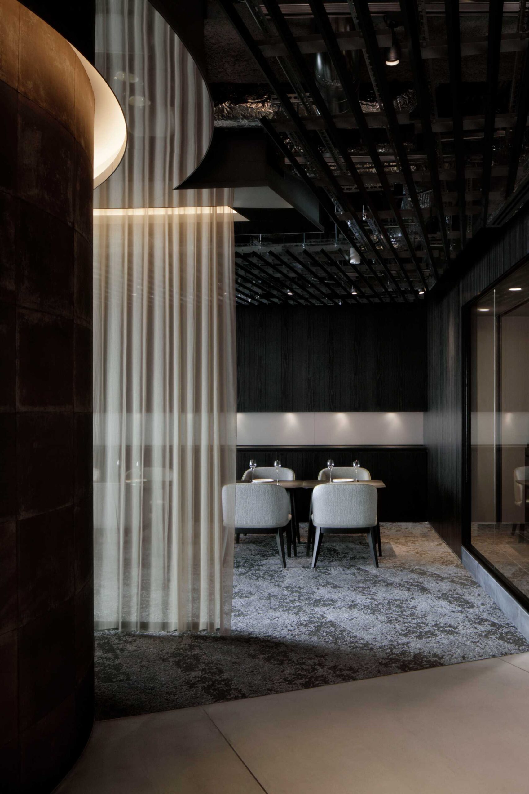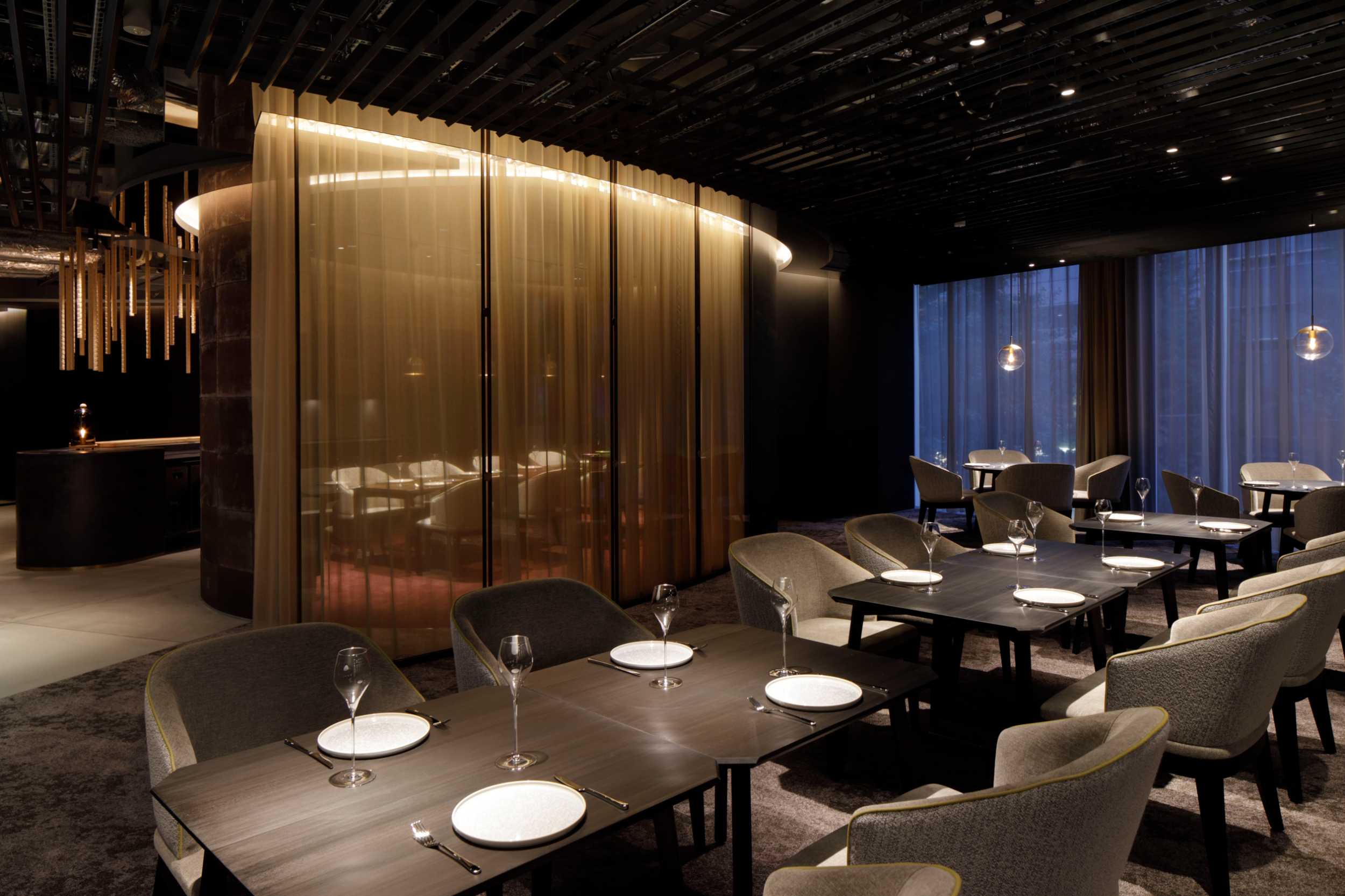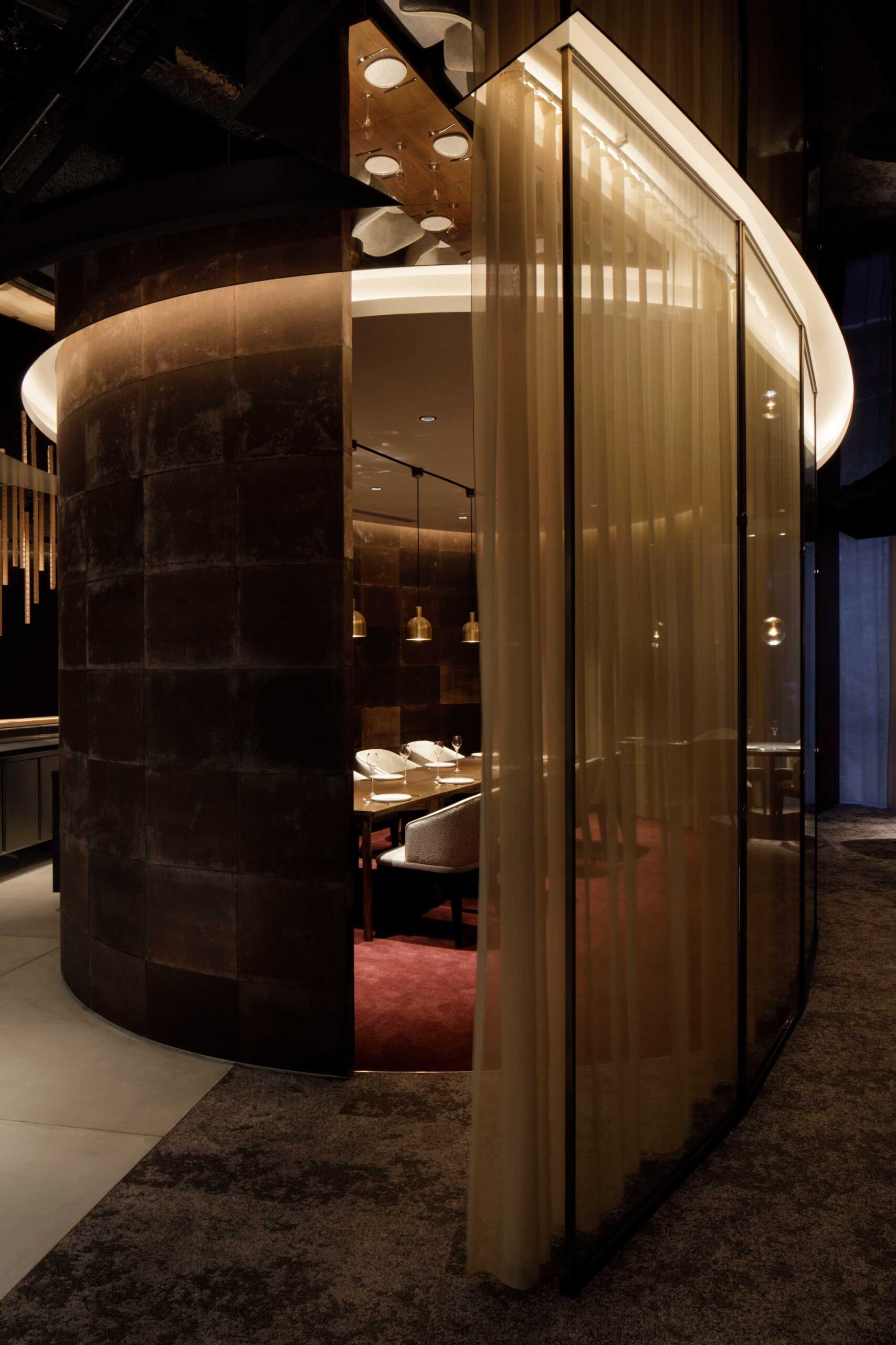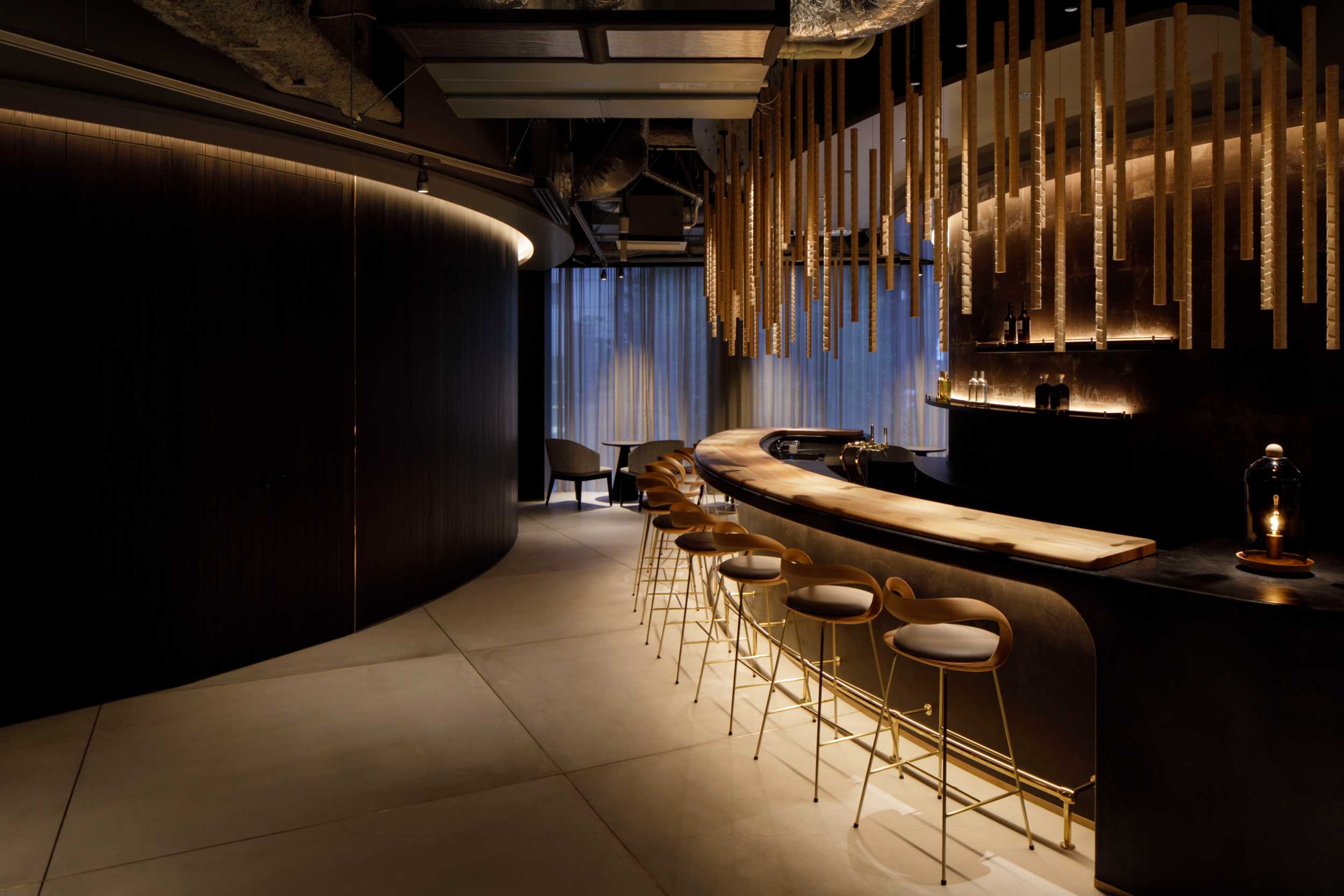 カタツムリのような壁ラインで、バーとホール席を緩やかに仕切っています。