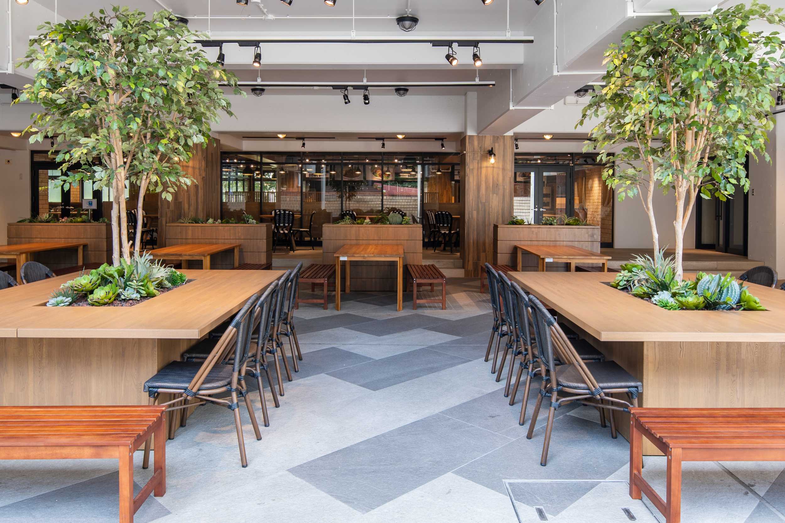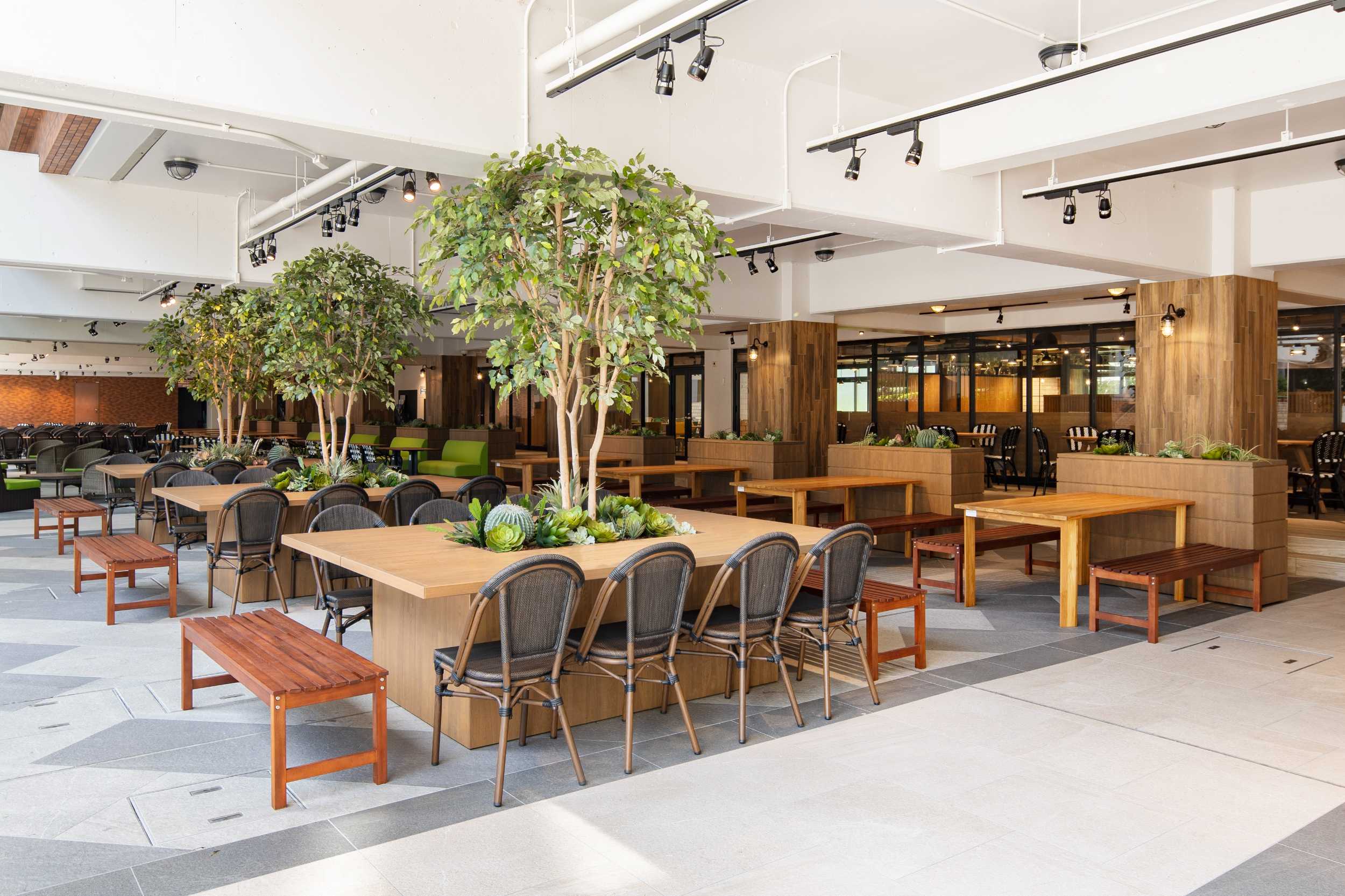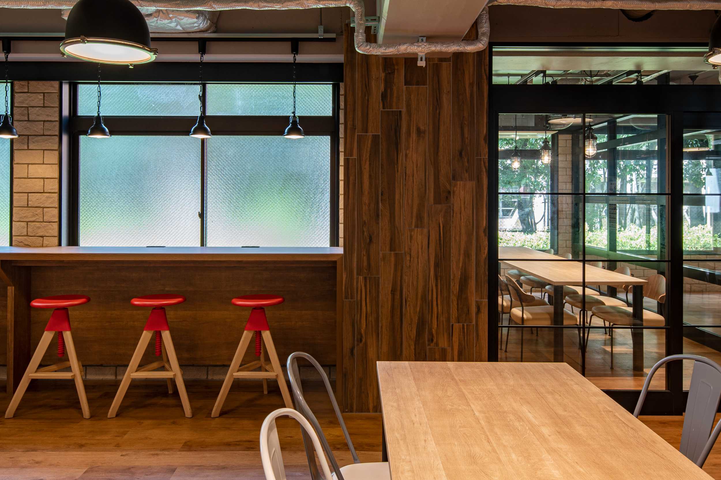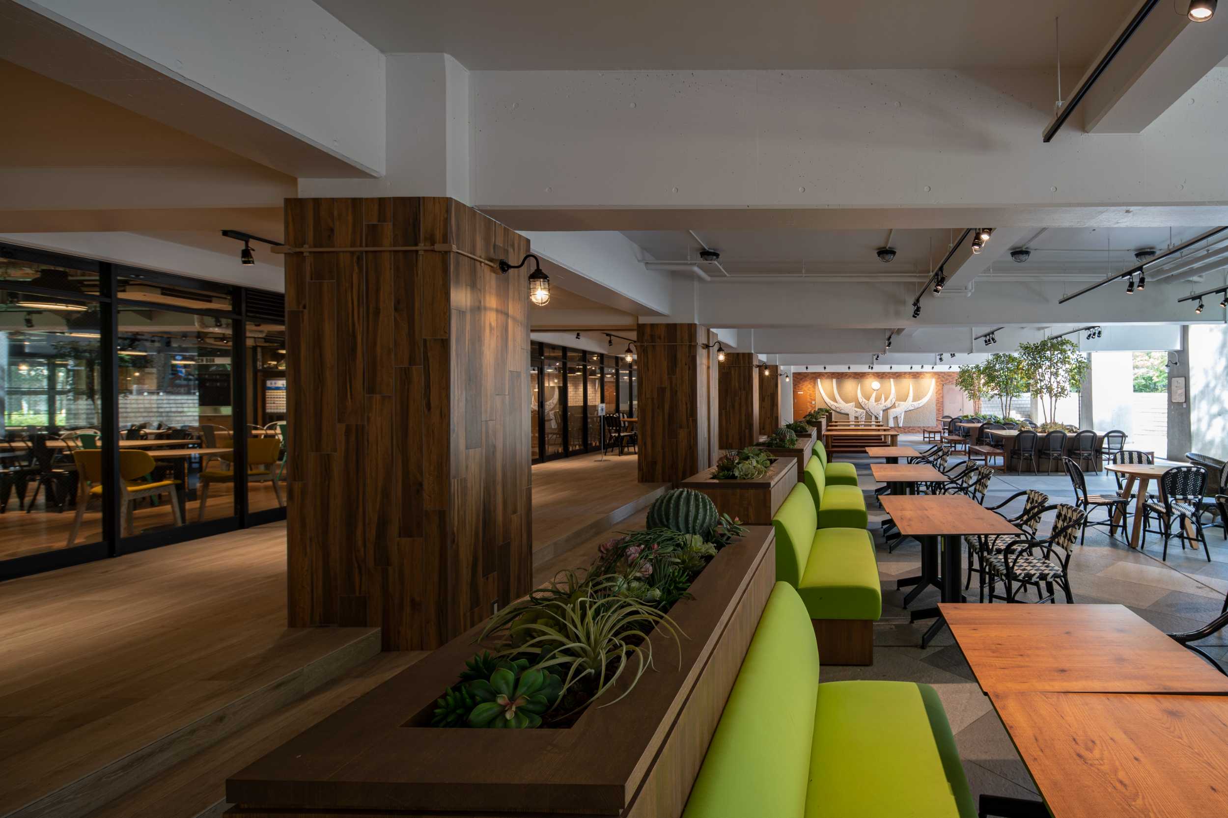 この食堂では、閑散としていたピロティを有効活用しました。