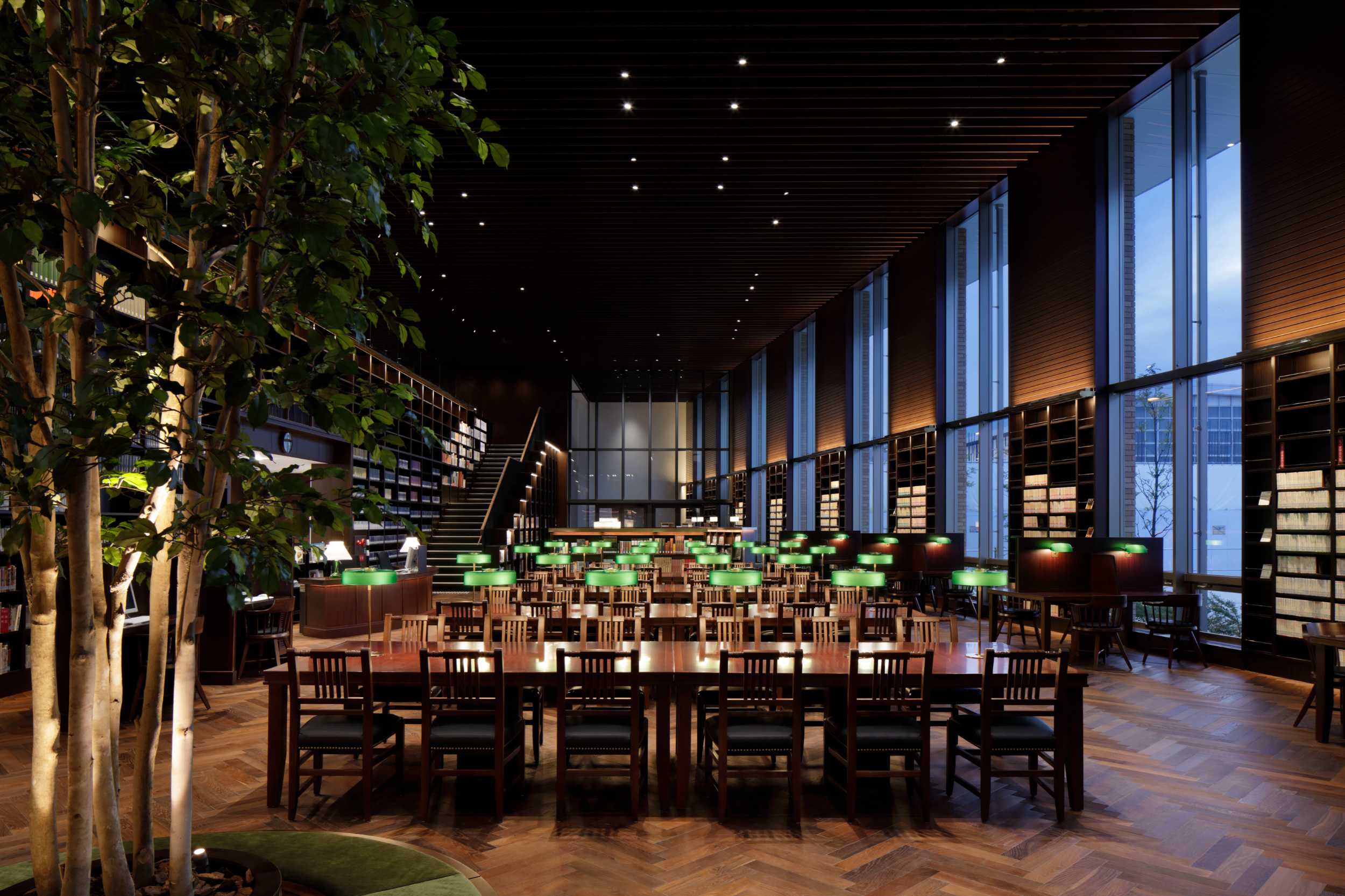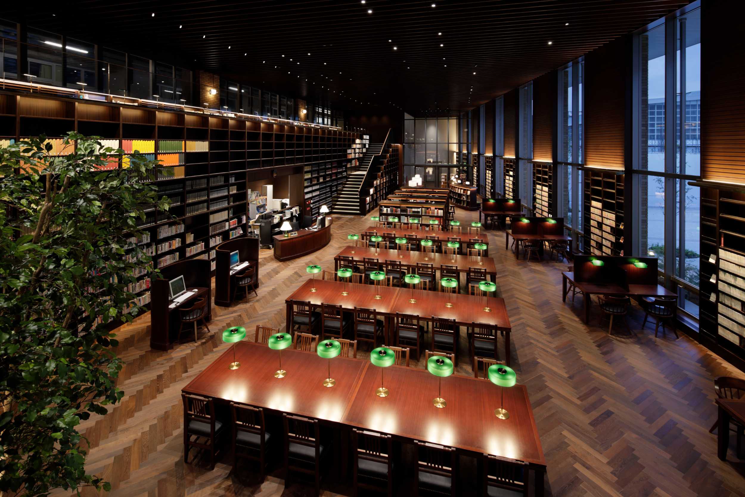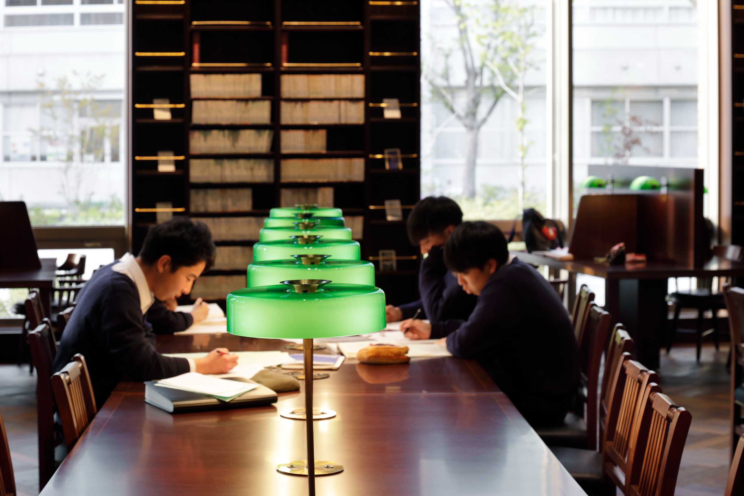 「学びの杜の探検」カジュアルな図書館ではなく、背筋が伸びるような少し緊張感のある空間。緑色の照明がポイントです。