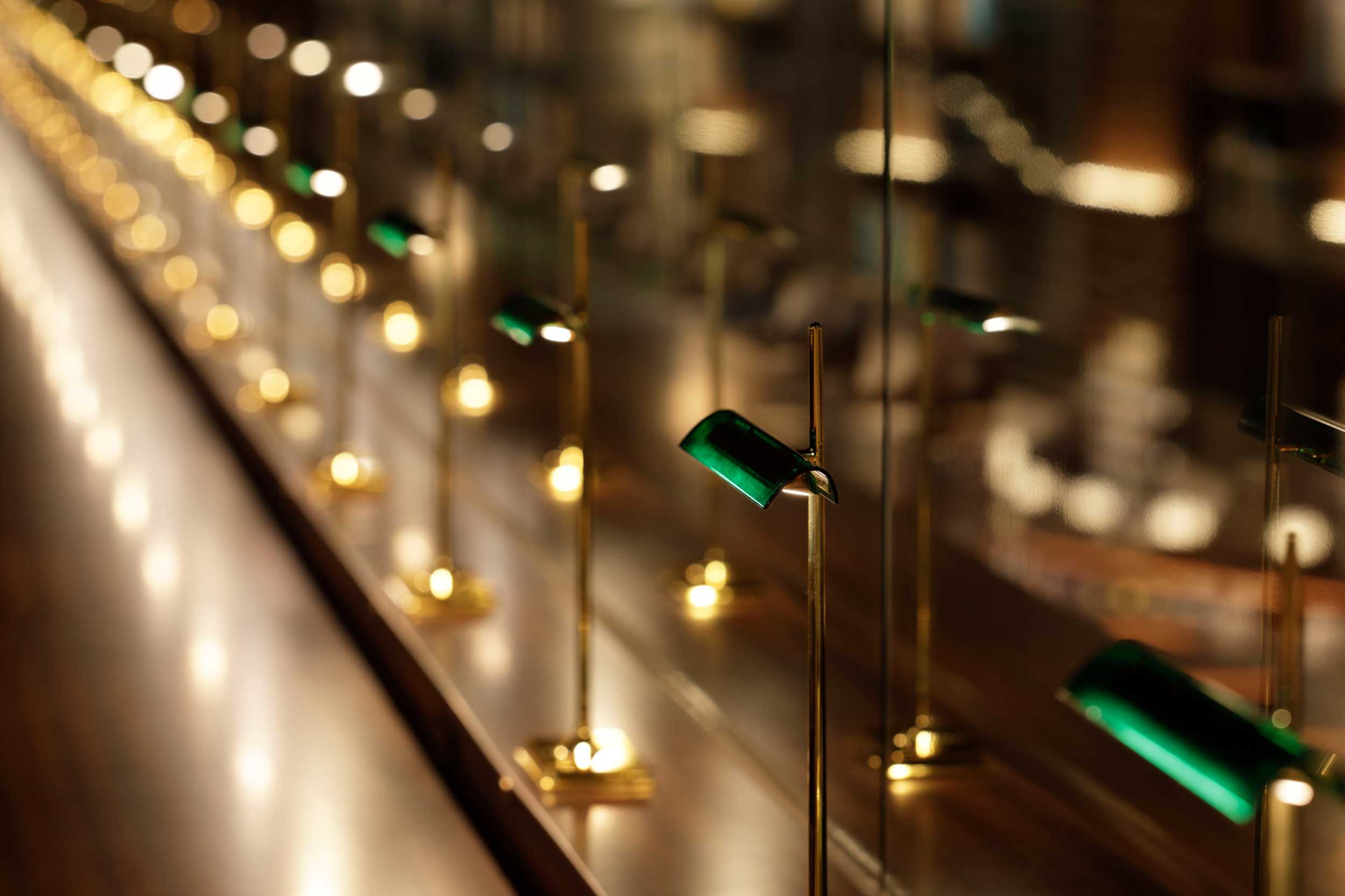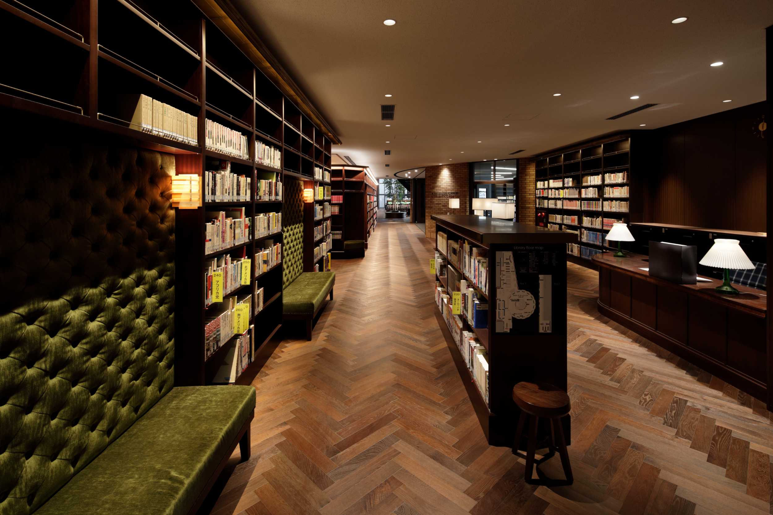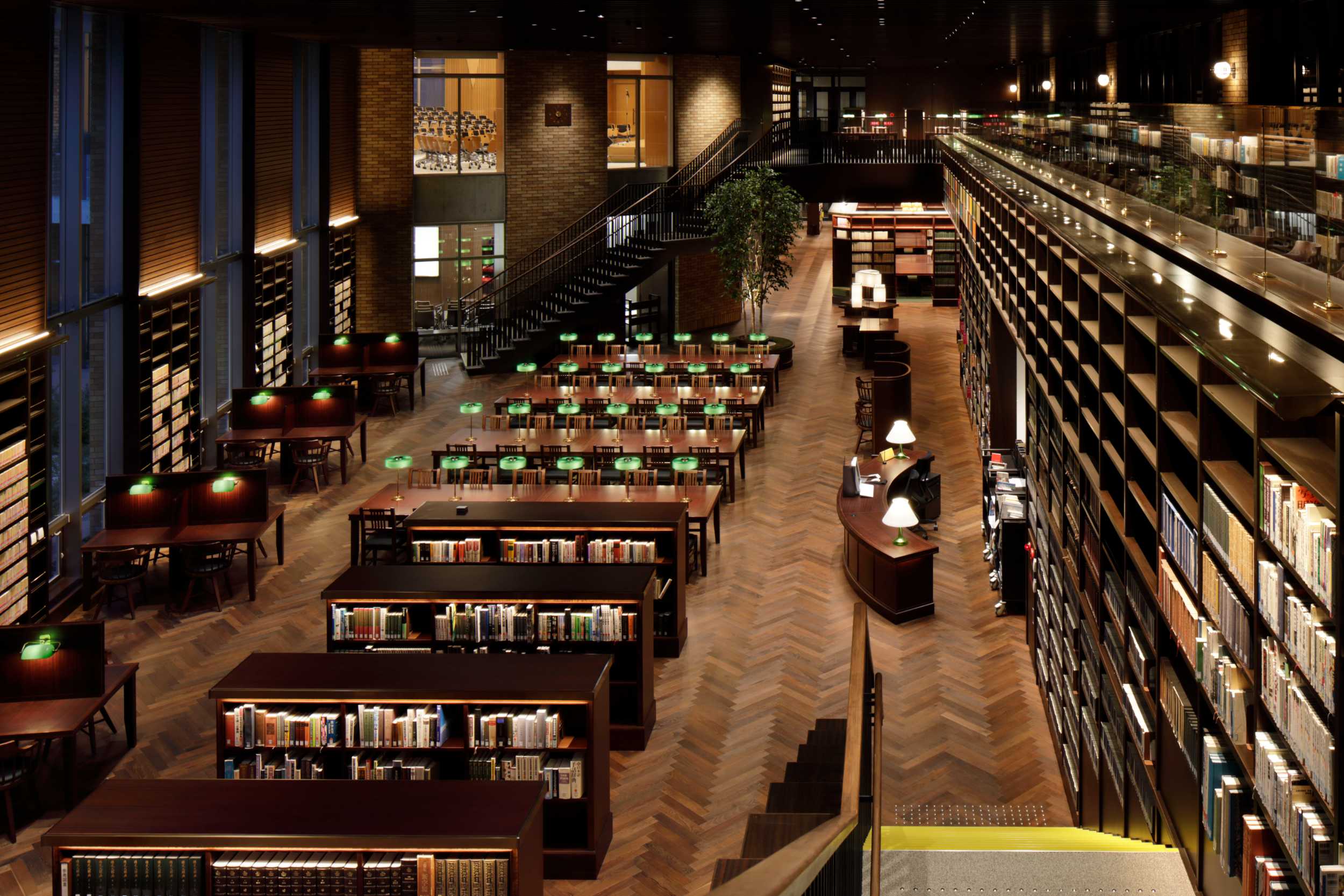 「学びの杜の探検」カジュアルな図書館ではなく、背筋が伸びるような少し緊張感のある空間。緑色の照明がポイントです。